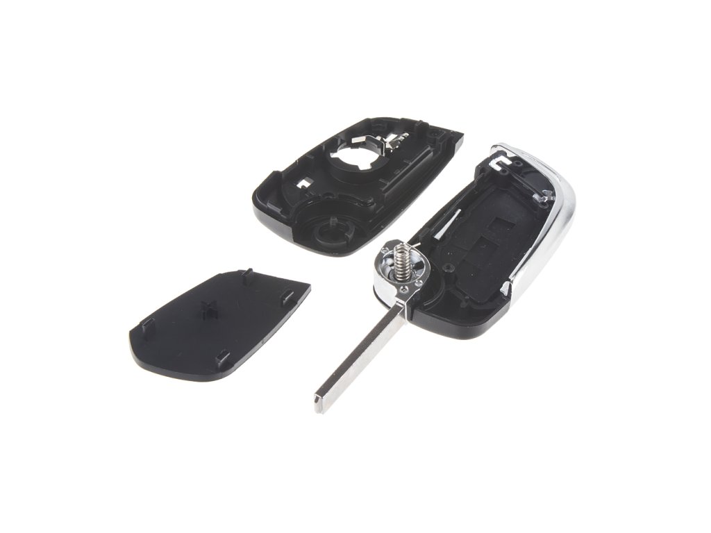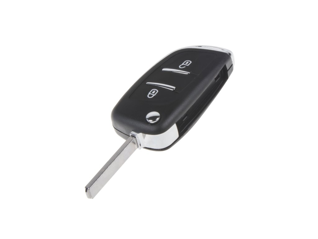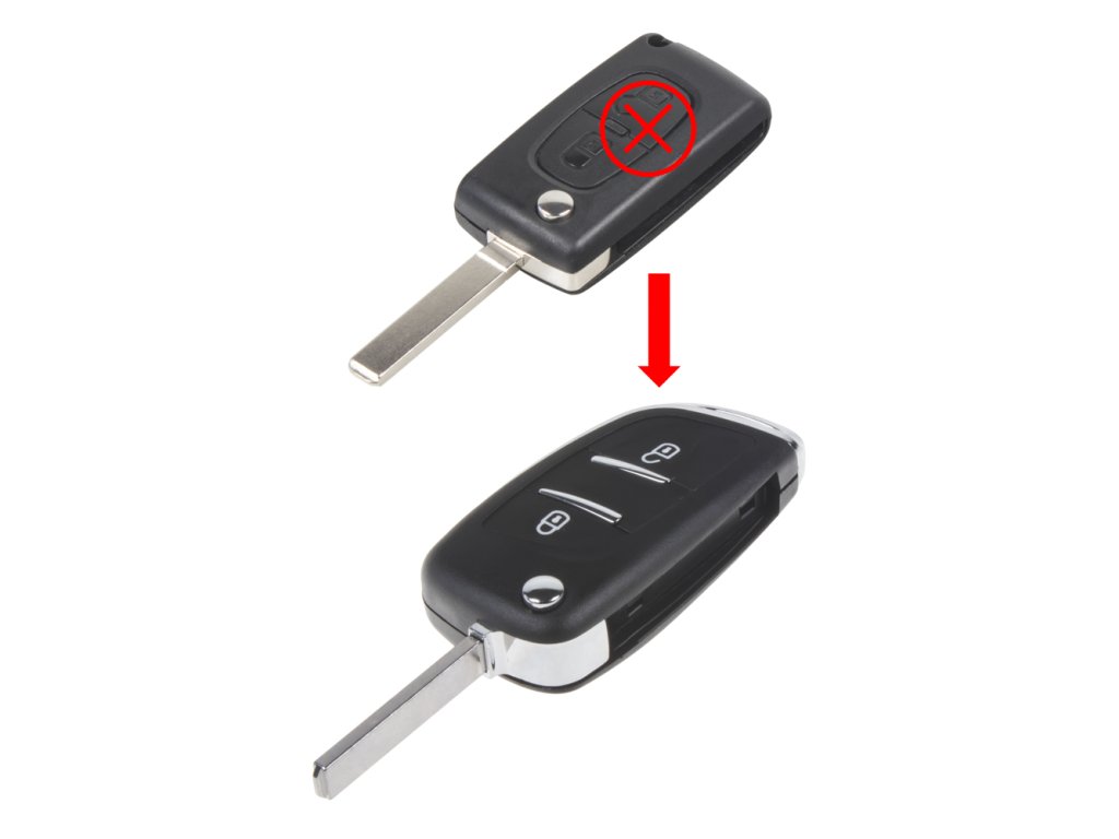 Náhradní obal vystřelovacího klíče pro vozy Citroën/Peugeot s 2-tlačítkovým vystřelovacím klíčem (bez elektroniky a čipu imobilizéru). Slouží pro změnu ze staršího vystřelovacího klíče na novější verzi. Do vystřelovacího klíče je nutno vložit z původního klíče elektroniku dálkového ovládání a čip imobilizéru (transpondér), planžetu klíče je třeba nechat vyfrézovat podle tvaru originálního klíče.