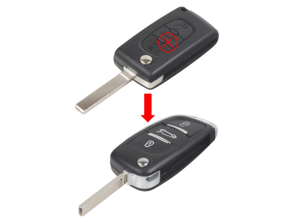 Náhradní obal vystřelovacího klíče pro vozy Citroën/Peugeot s 3-tlačítkovým vystřelovacím klíčem (bez elektroniky a čipu imobilizéru). Slouží pro změnu ze staršího vystřelovacího klíče na novější verzi. Do vystřelovacího klíče je nutno vložit z původního klíče elektroniku dálkového ovládání a čip imobilizéru (transpondér), planžetu klíče je třeba nechat vyfrézovat podle tvaru originálního klíče.
