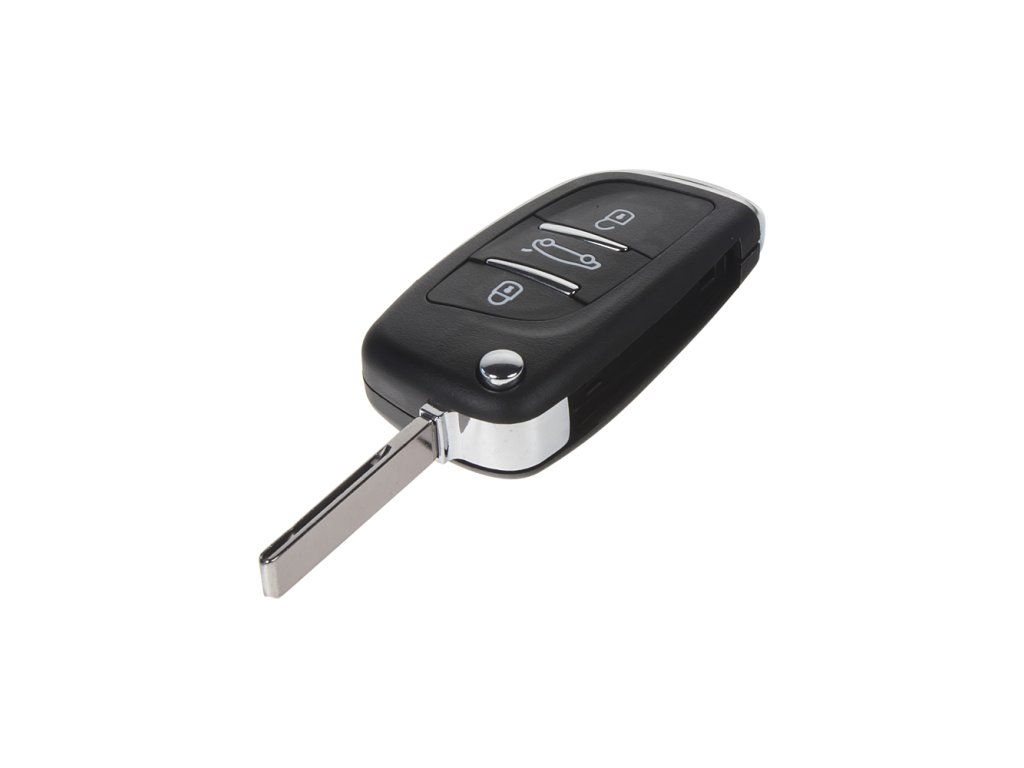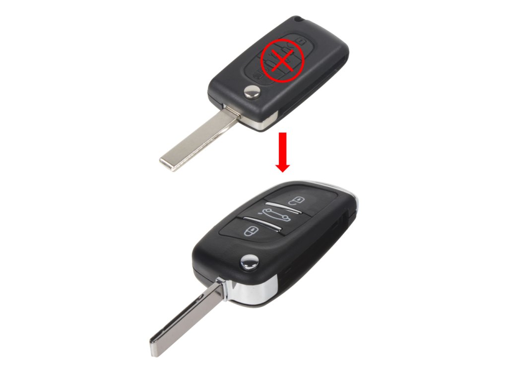 Náhradní obal vystřelovacího klíče pro vozy Citroën/Peugeot s 3-tlačítkovým vystřelovacím klíčem (bez elektroniky a čipu imobilizéru). Slouží pro změnu ze staršího vystřelovacího klíče na novější verzi. Do vystřelovacího klíče je nutno vložit z původního klíče elektroniku dálkového ovládání a čip imobilizéru (transpondér), planžetu klíče je třeba nechat vyfrézovat podle tvaru originálního klíče.