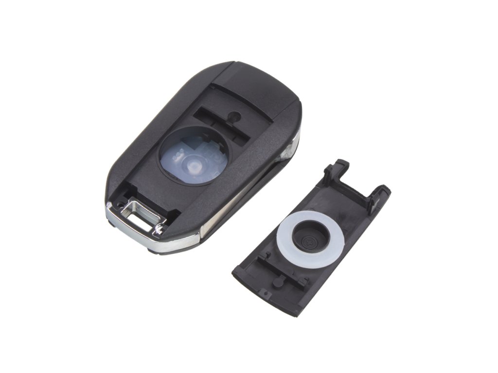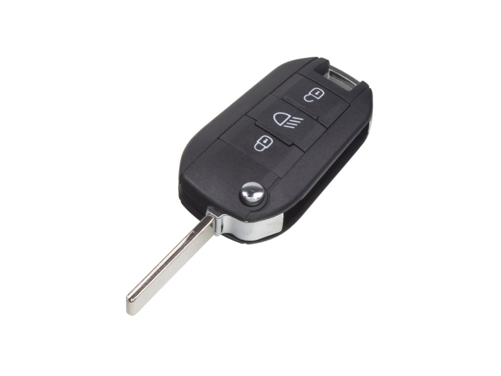 Náhradní obal vystřelovacího klíče pro vozy Peugeot/Citroën/Toyota s 3-tlačítkovým vystřelovacím klíčem (bez elektroniky a čipu imobilizéru). Do vystřelovacího klíče je nutno vložit z původního klíče elektroniku dálkového ovládání, planžetu klíče je třeba nechat vyfrézovat podle tvaru originálního klíče.
