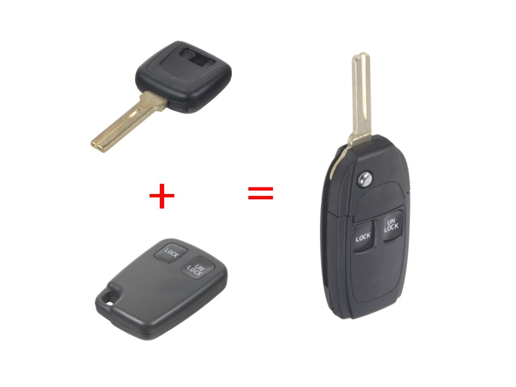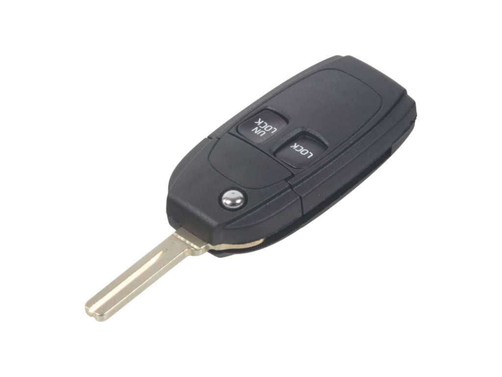 Náhradní obal vystřelovacího klíče pro vozy Volvo s 2-tlačítkovým ovladačem (bez elektroniky a čipu imobilizéru). Do klíče je nutno vložit z původního klíče elektroniku dálkového ovládání a čip imobilizéru (transpondér), planžetu klíče je třeba nechat vyfrézovat podle tvaru originálního klíče.