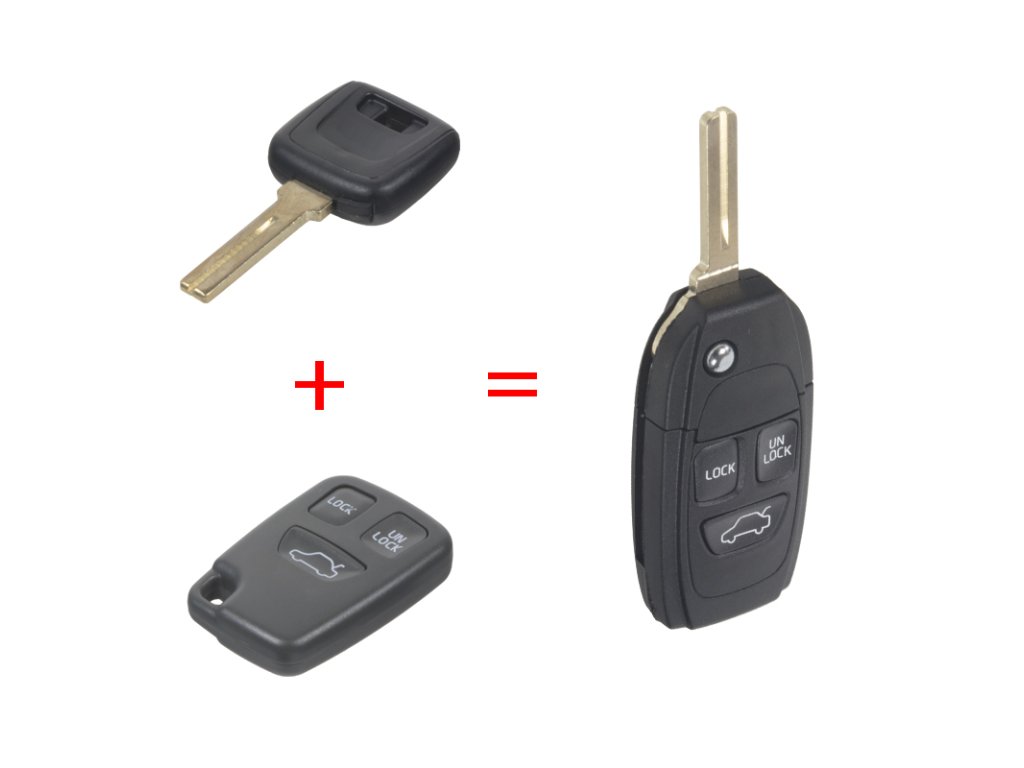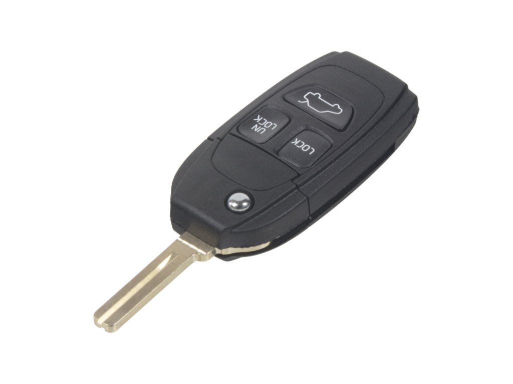 Náhradní obal vystřelovacího klíče pro vozy Volvo s 3-tlačítkovým ovladačem (bez elektroniky a čipu imobilizéru). Do klíče je nutno vložit z původního klíče elektroniku dálkového ovládání a čip imobilizéru (transpondér), planžetu klíče je třeba nechat vyfrézovat podle tvaru originálního klíče.