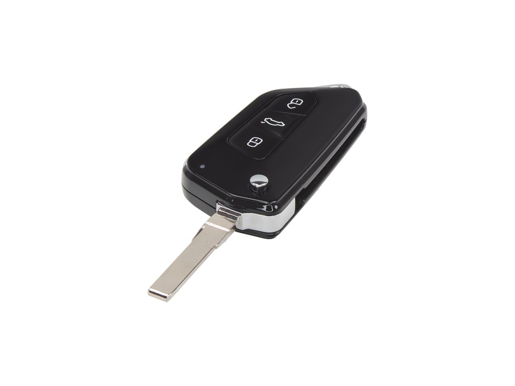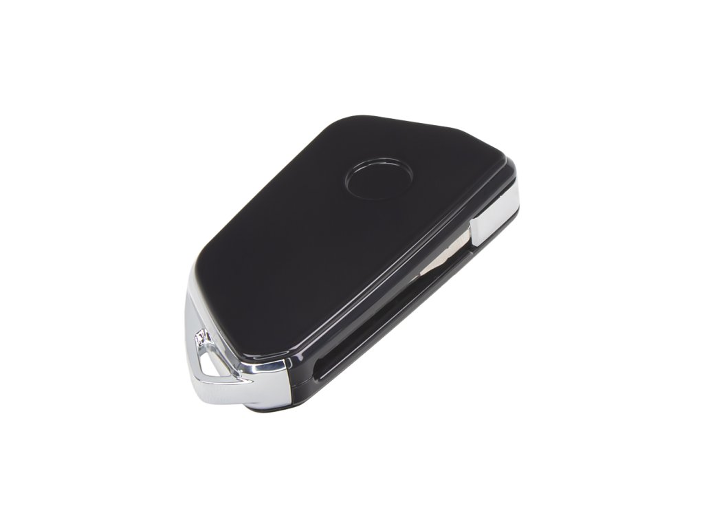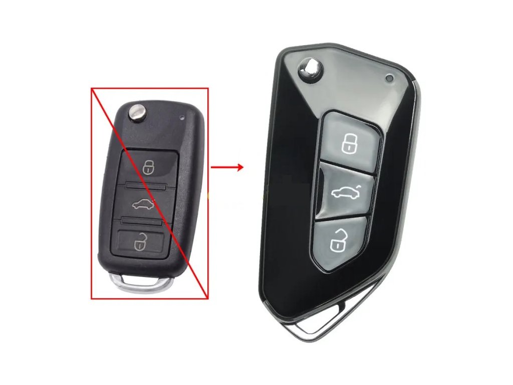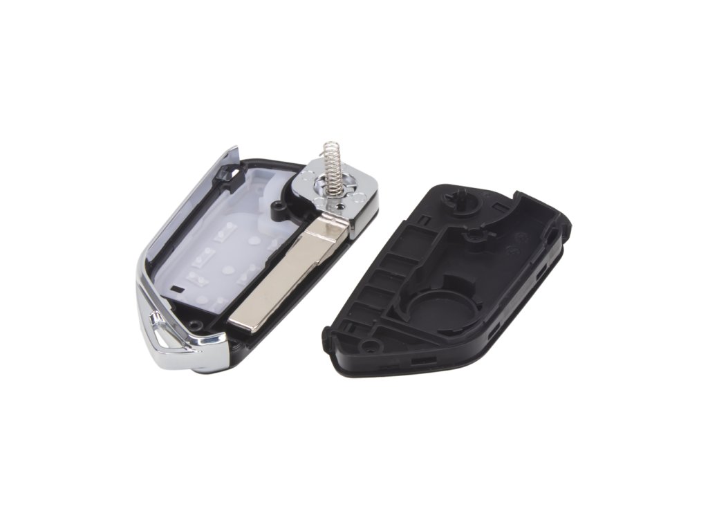 Náhradní obal vystřelovacího klíče pro vozy Volkswagen, Škoda a Seat s 3-tlačítkovým vystřelovacím klíčem(bez elektroniky a čipu imobilizéru). Slouží pro změnu ze staršího vystřelovacího klíče na nejnovější verzi s vystřelovacím klíčem. Do vystřelovacího klíče je nutno vložit z původního klíče elektroniku dálkového ovládání a čip imobilizéru (transpondér), planžetu klíče je třeba nechat vyfrézovat podle tvaru originálního klíče.