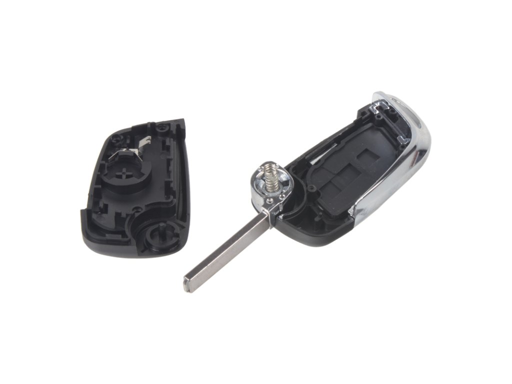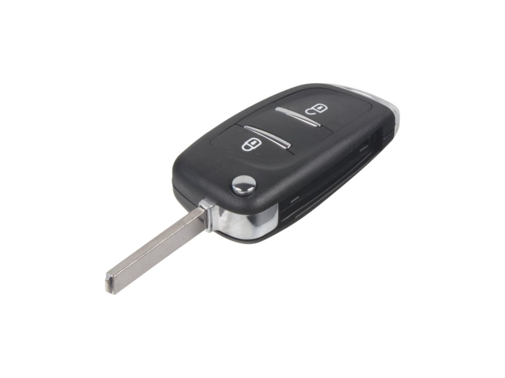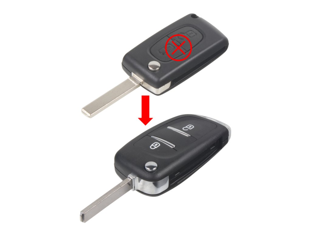 Náhradní obal vystřelovacího klíče Citroën s 2-tlačítkovým nevystřelovacím klíčem (48CT101) (bez elektroniky a čipu imobilizéru). Slouží pro změnu ze staršího vystřelovacího klíče na novější verzi s vystřelovacím klíčem. Do klíče je nutno vložit z původního klíče elektroniku dálkového ovládání a čip imobilizéru (transpondér), planžetu klíče je třeba nechat vyfrézovat podle tvaru originálního klíče.