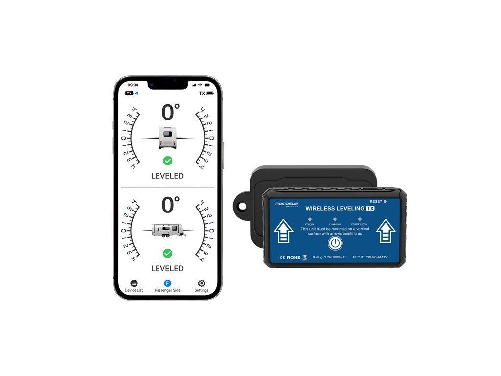 Náklonoměr pro karavany s přenosem do APP (mobilního telefonu), je zařízení určené k měření náklonu vozidla, což usnadňuje jeho přesné vyrovnání na nerovném terénu.