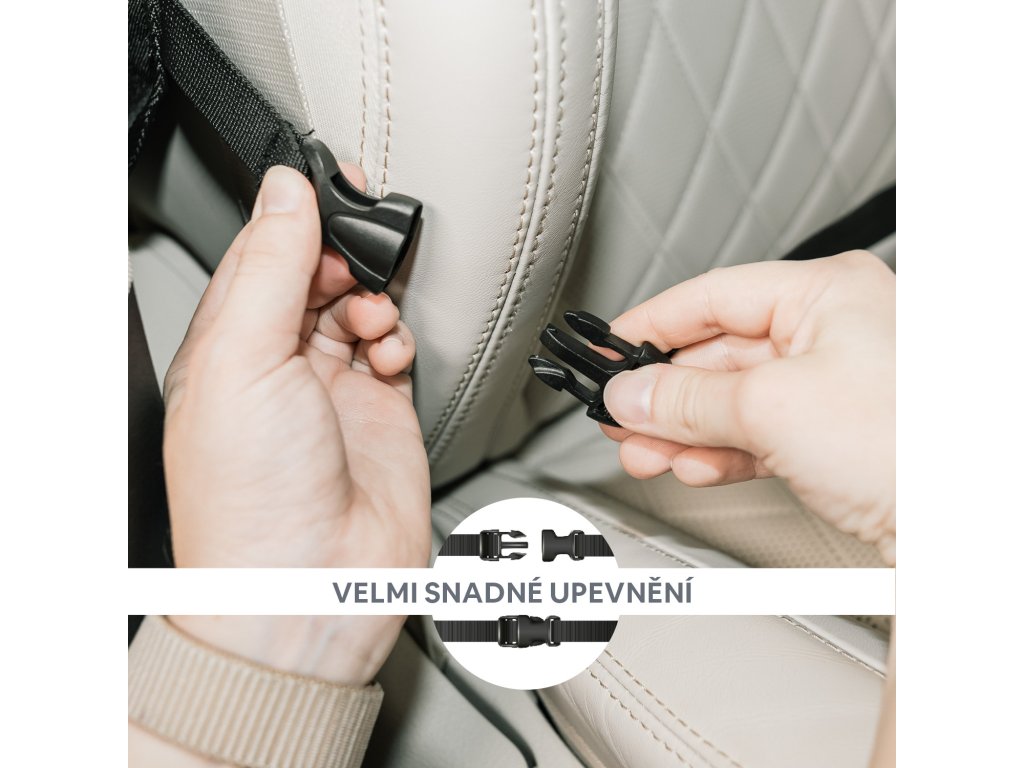 Nastavitelné bezpečnostní popruhy se snadno připevní k jakékoli opěrce hlavy sedadla, což zajišťuje snadnou instalaci a pevné uchycení. Tato ochrana je kompatibilní s většinou automobilů.