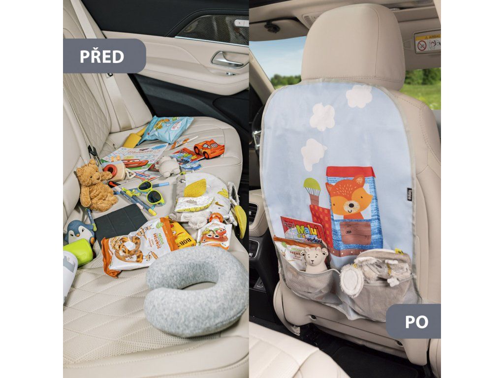 Kromě ukládání věcí organizér slouží jako ochrana proti okopávání – už žádné otisky dětských bot na sedadlech.