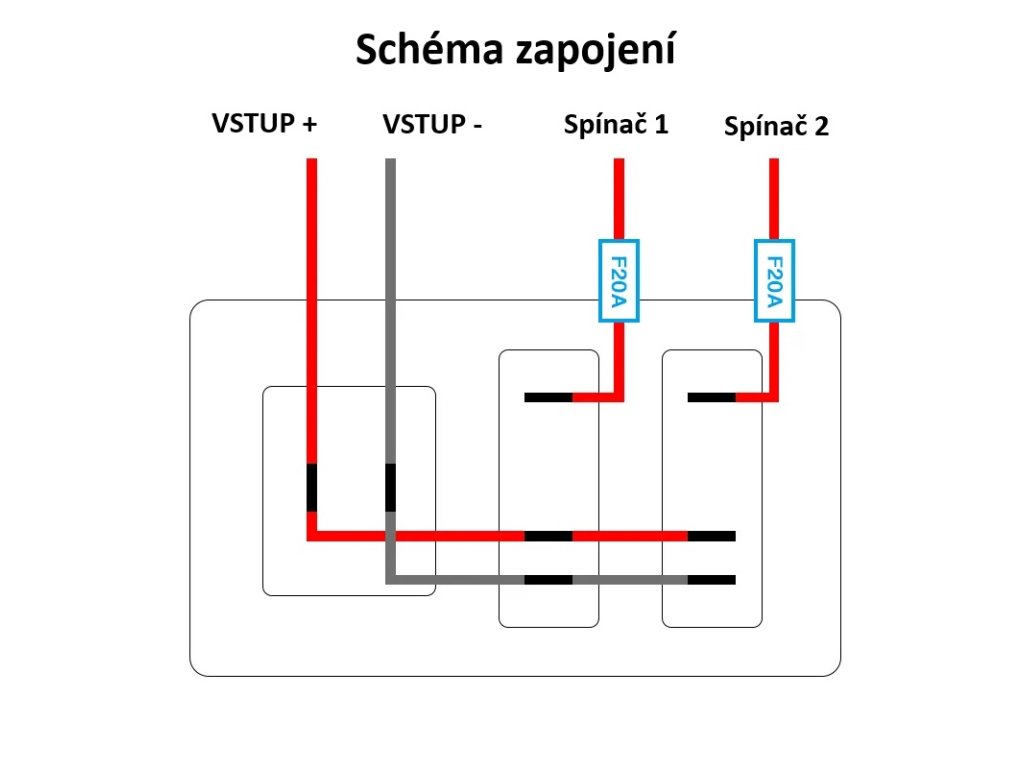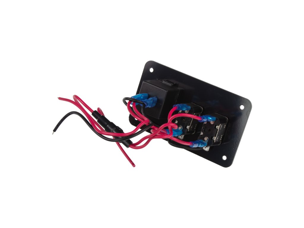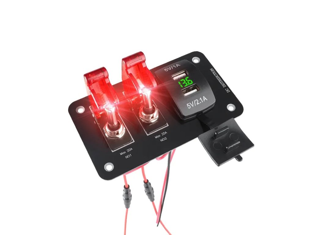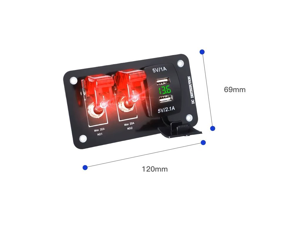 Univerzální panel s 2x podsvíceným spínačem s krytkou a 2x USB nabíječkou s voltmetrem.