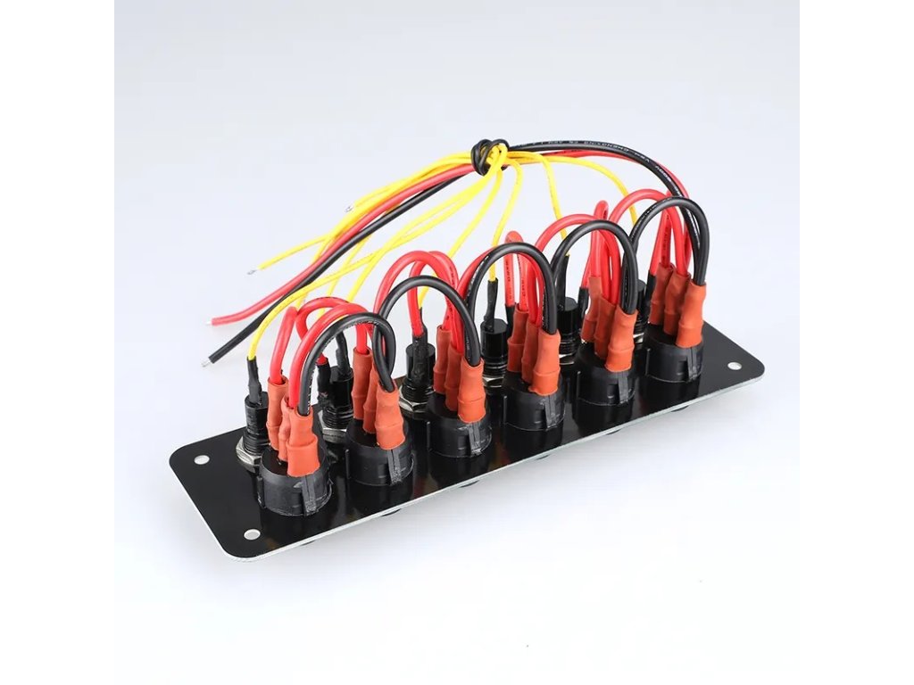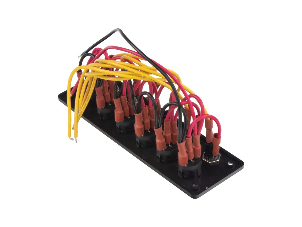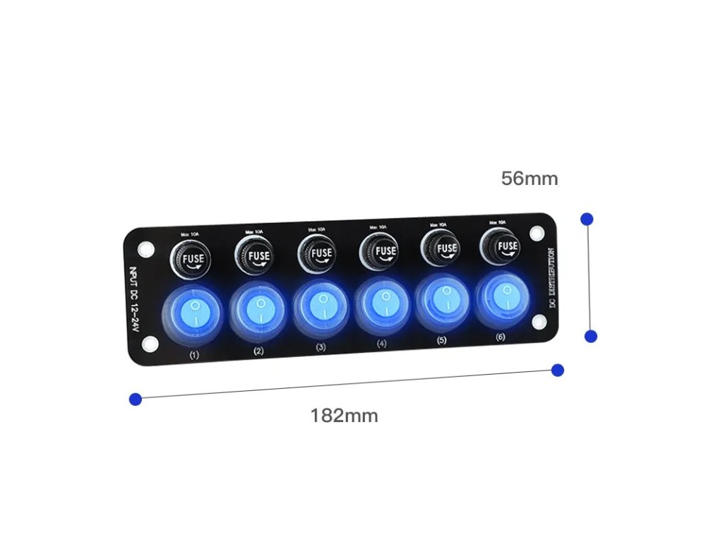 Univerzální panel s 6x modře podsvětleným spínačem a 6x pojistkou.