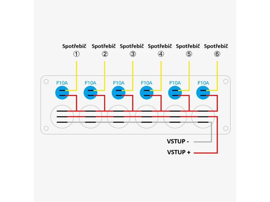 • max. proud: 60 A (6x 10 A) / pojistka: 5 mm x 20 mm