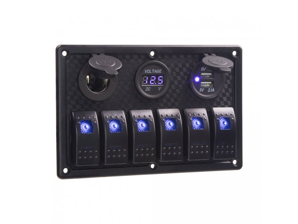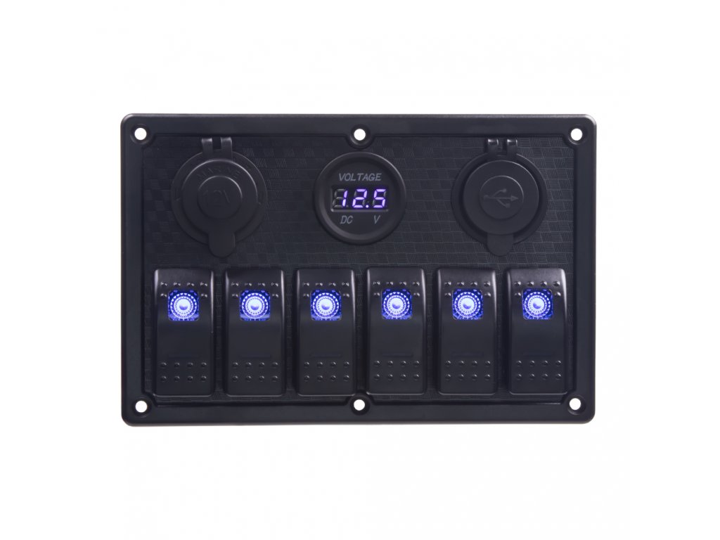Panel s 6x spínači Rocker, voltmetr, CL + USB zásuvka, 12/24V