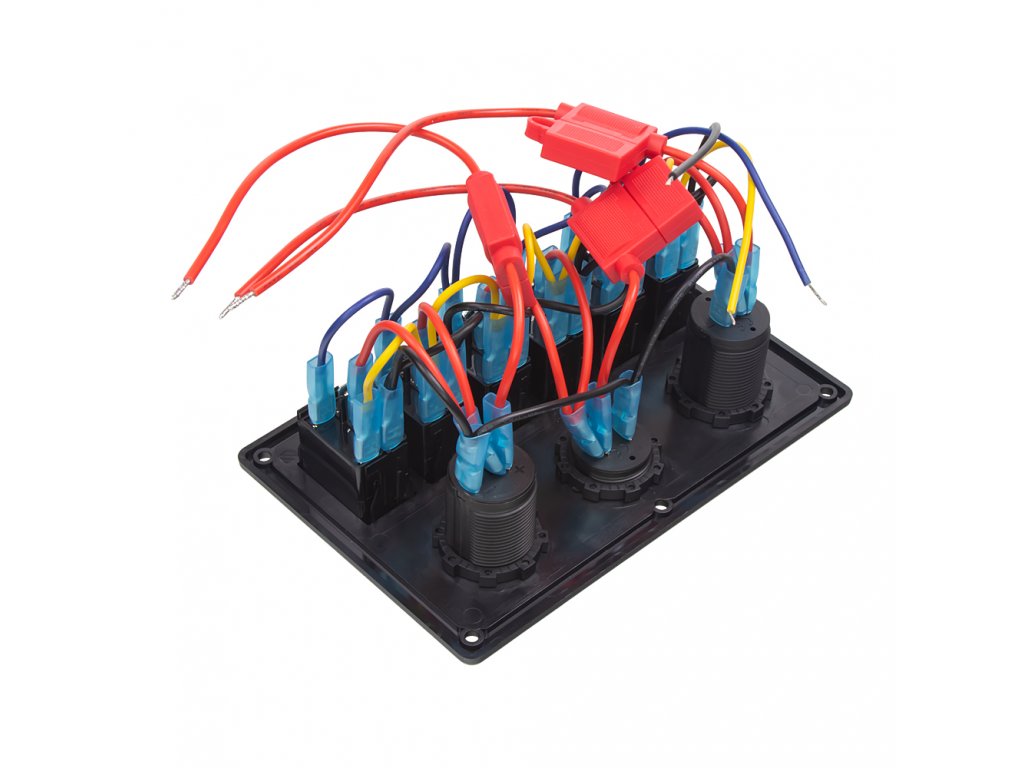 Panel s 6x spínači Rocker, CL a 2x USB zásuvka + voltmetr. Technické parametry: • napájecí napětí 12/24 V • 3x pojistka 15 A • 2x USB zásuvka 5 V/2,1 A ; 5 V/1 A • zatížení spínačů: max. 20 A/12 V - 10 A/24 V • 1x CL zásuvka • voltmetr • rozměry panelu: 183 x 120 mm •...