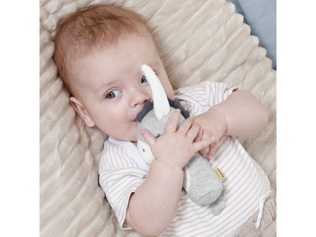 miminka. Hračka s chrastítkem podporuje hmat a sluch dítěte, stejně jako jeho