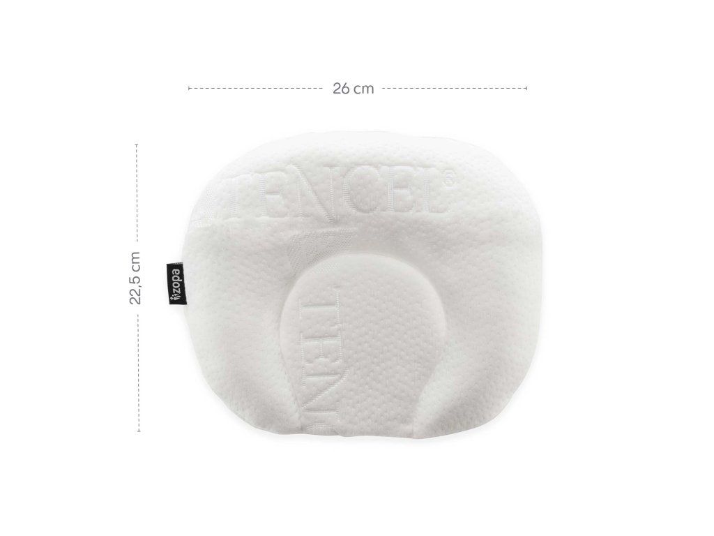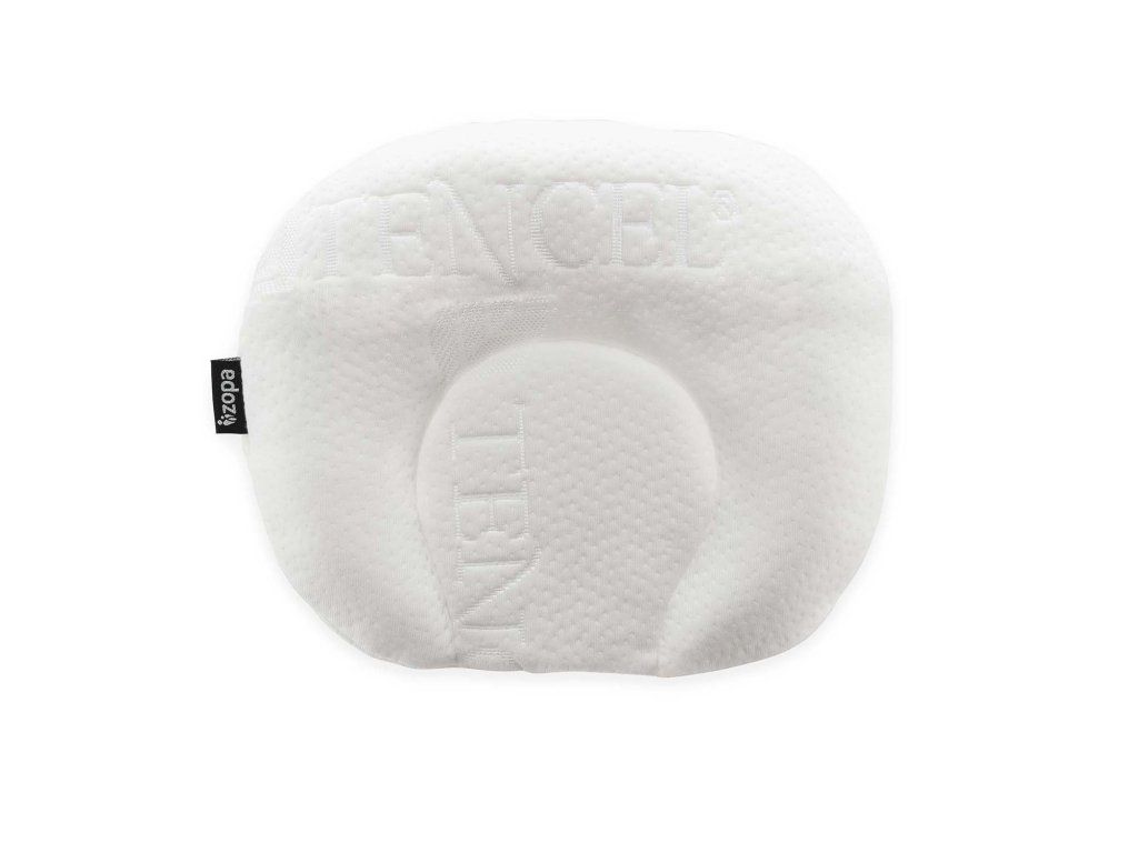 Měkký polštářek v bílé barvě je vyroben z měkké paměťové pěny, která se přizpůsobí tvaru těla a hlavy miminka.