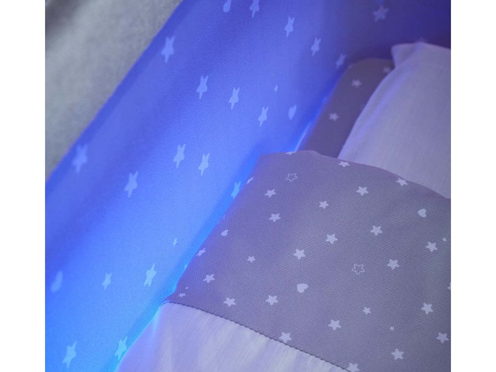 Set obsahuje: rám postýlky, matraci, bočnice, povlečení na polštář a peřinku,