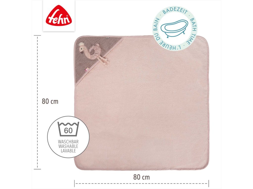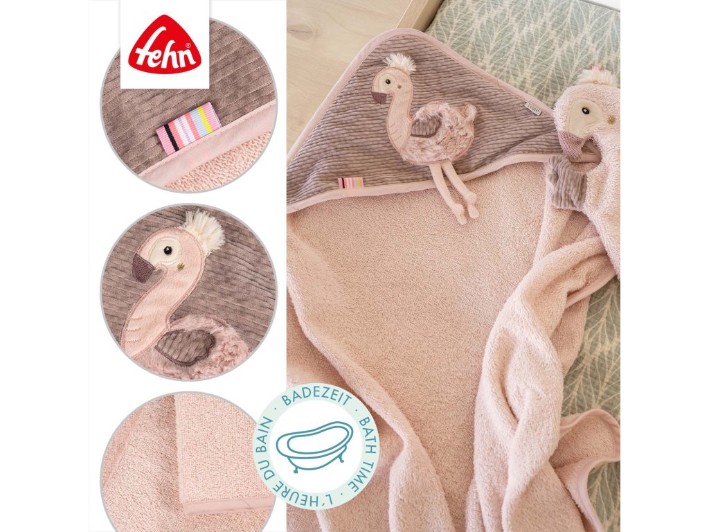 na pláži jemný a velmi savý dětský ručník s kapucí a plyšovou aplikací plameňáka