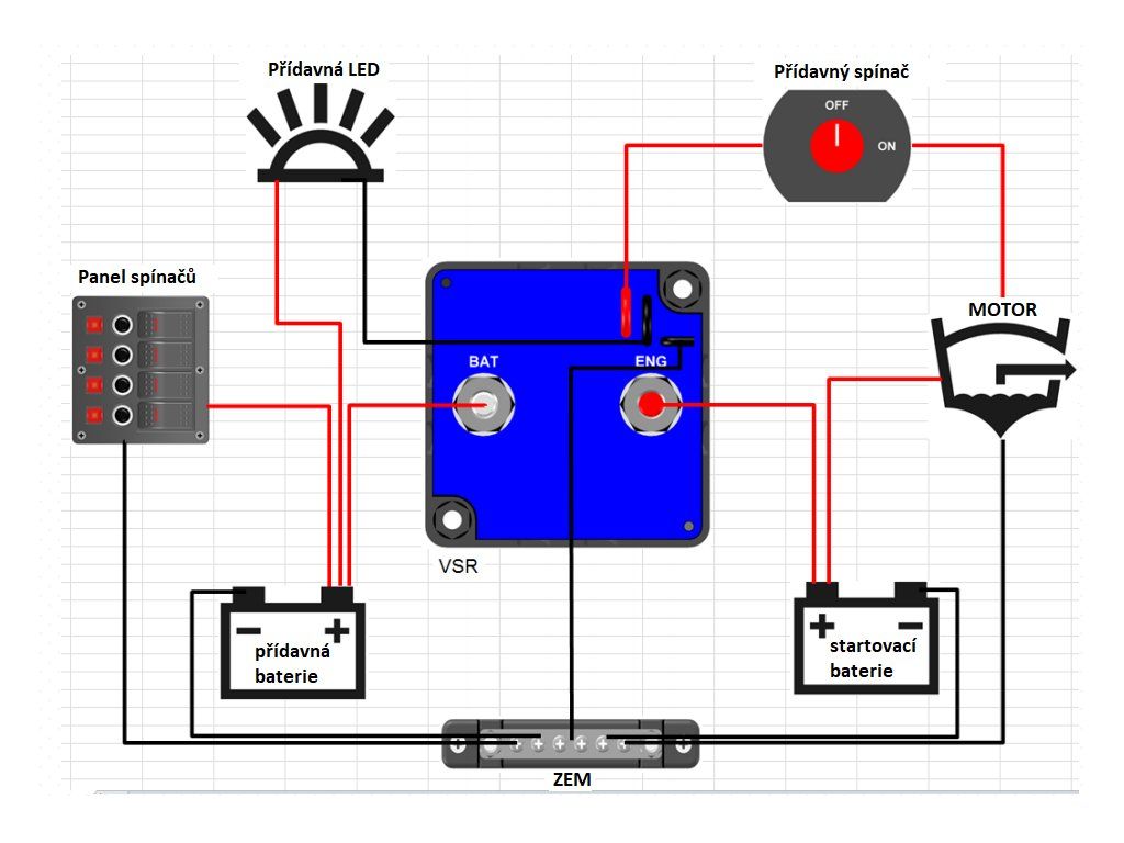 • červená smyčka - manuální sepnutí relé +12V