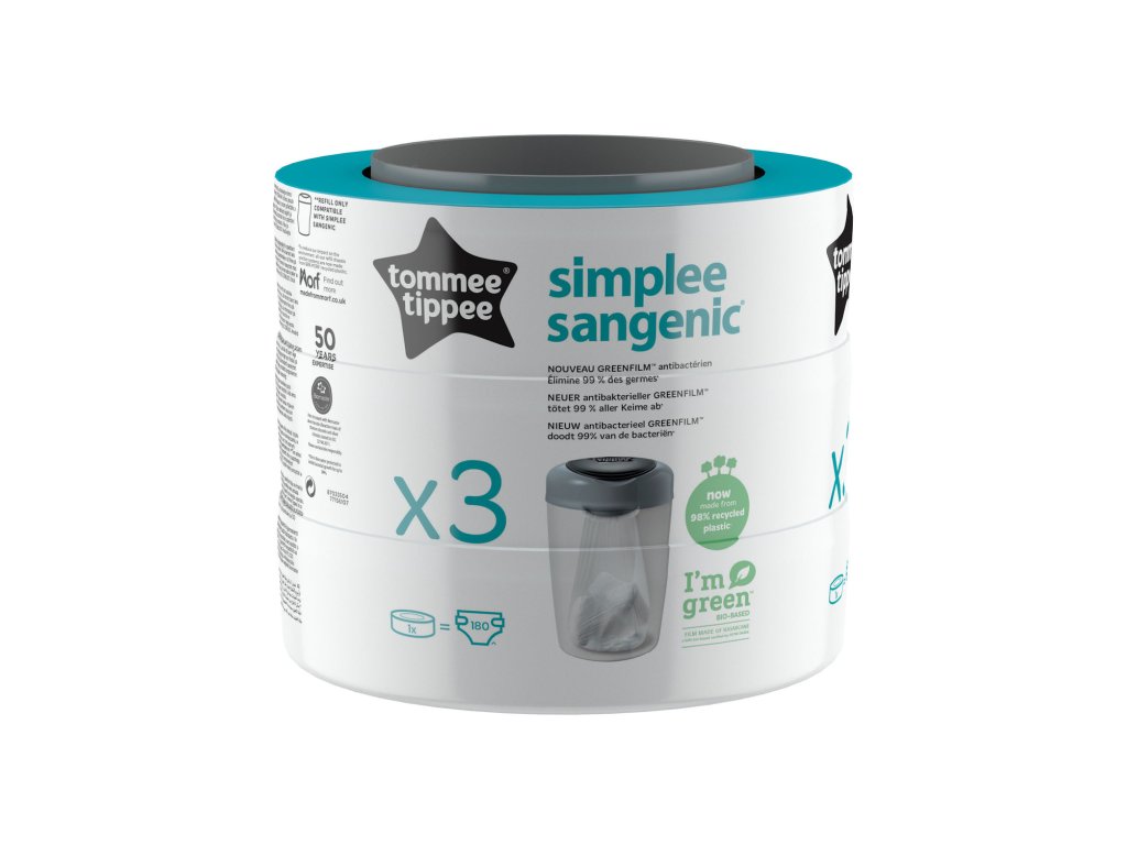 Náhradní kazety s antibakteriální fólií do koše Tommee Tippee Sangenic Simplee nabízí jednoduchý způsob, jak udržet v dětském pokoji čistotu bez zápachu. Antibakteriální složka fólie zničí 99% baktérií. Kapacita jedné kazety je až 180 plen (vel. 2–5kg).