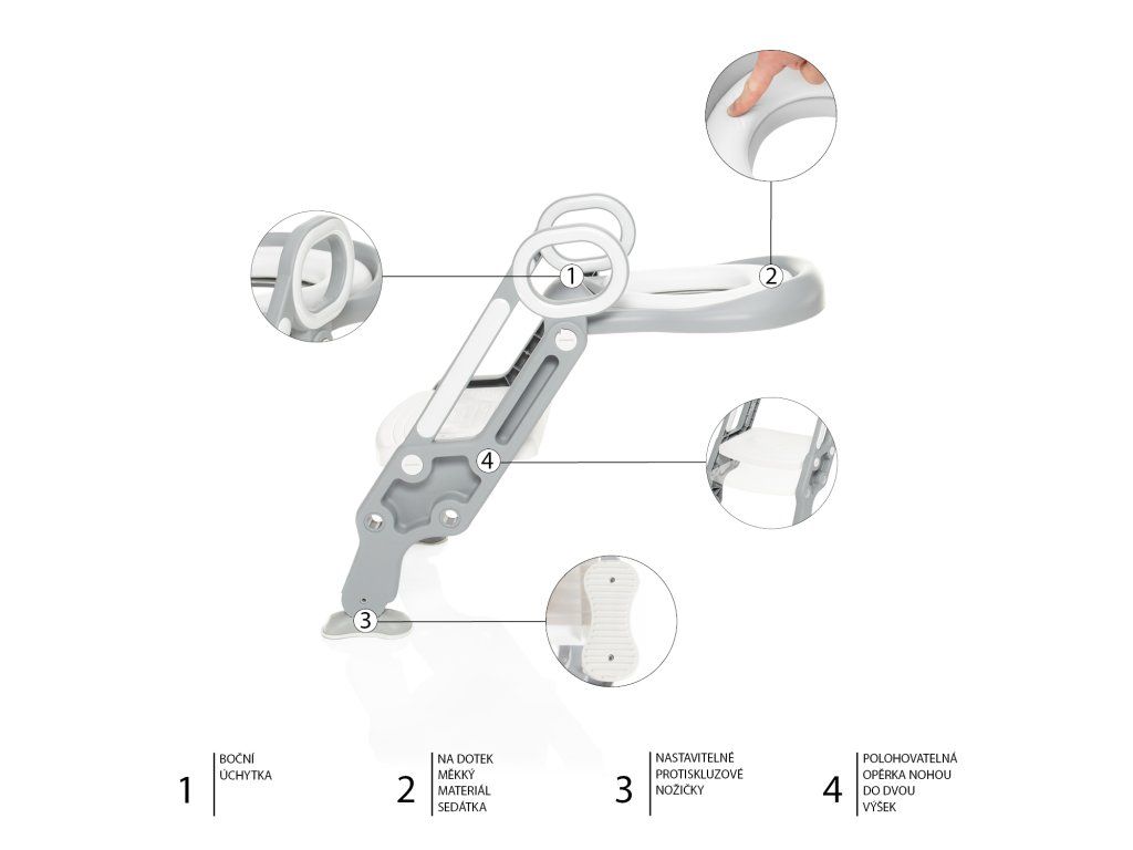 Schůdky díky výškové nastavitelnosti porostou s vaším dítětem až do doby, kdy už je nebude potřebovat. Pevná konstrukce zaručuje, že se dítě bude při šplhání i sezení cítit bezpečně. Nohy jsou vybaveny speciální protiskluzovou vrstvou, která poskytuje pocit stability a opory. Součástí schůdků je také měkký a pohodlný sedák, který slouží jako redukce na klasický záchod. Anatomický tvar sedáku spolu s vyvýšenou zadní stranou dokonale zabraňuje nechtěnému znečištění.