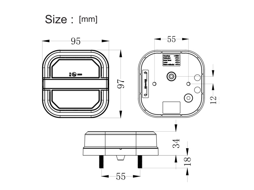 • rozměry: výška 110 mm, šířka 108 mm, hloubka 34 mm, rozteč upevňovacích šroubů 55 mm