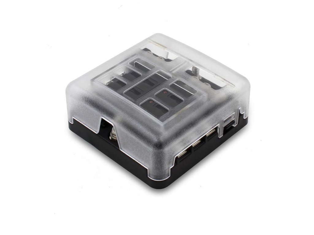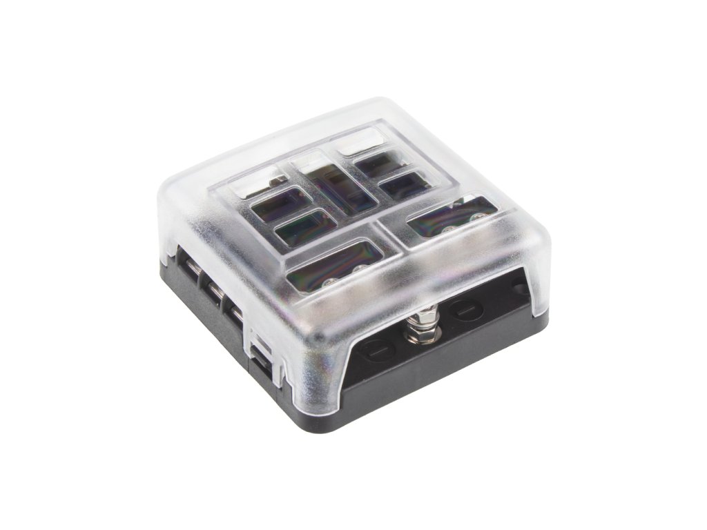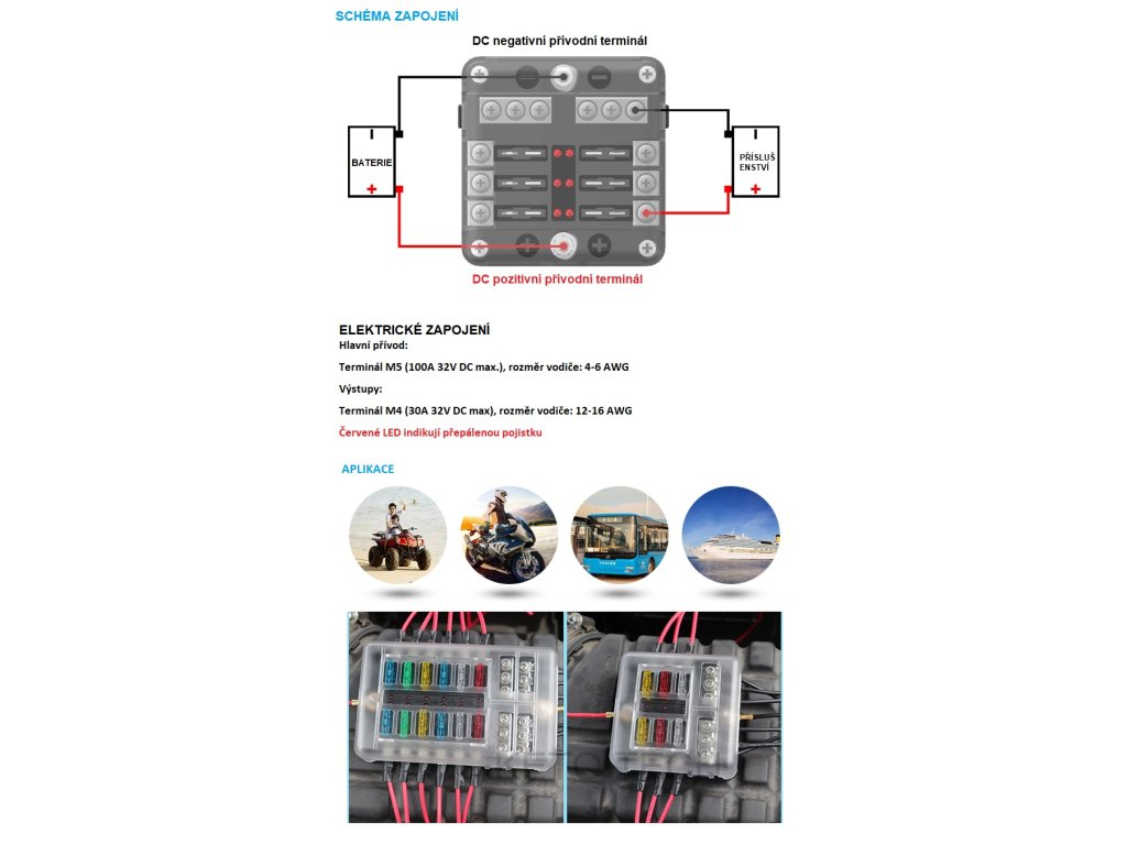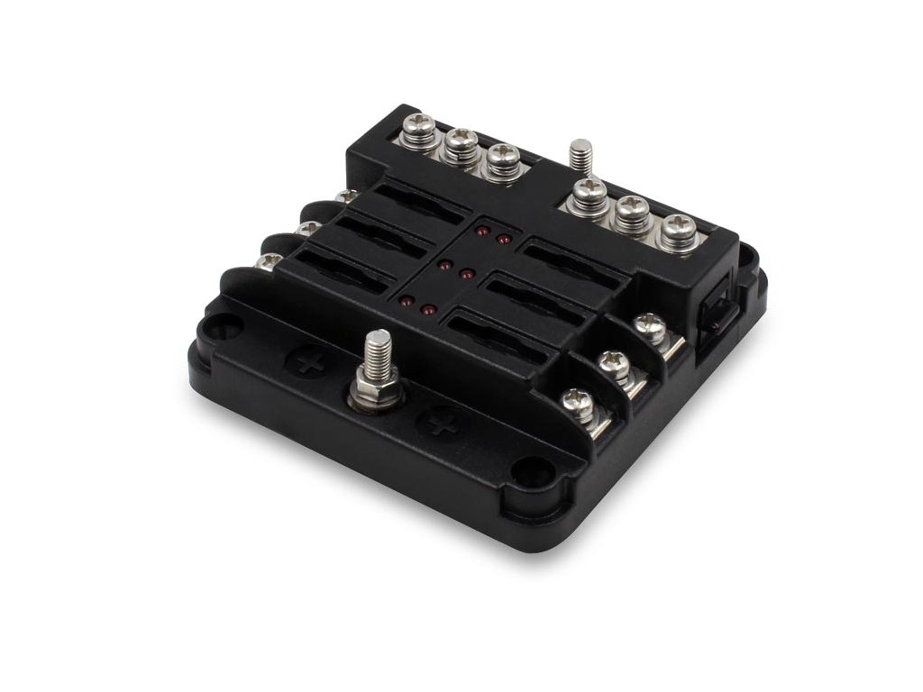 Tento všestranný pojistkový blok poskytuje pojistkové rozvody kladných pólů i rozvody záporných vodičů. To je zvláště praktické na lodi nebo karavanu, které nemusí mít systém typu ukostřené karoserie.