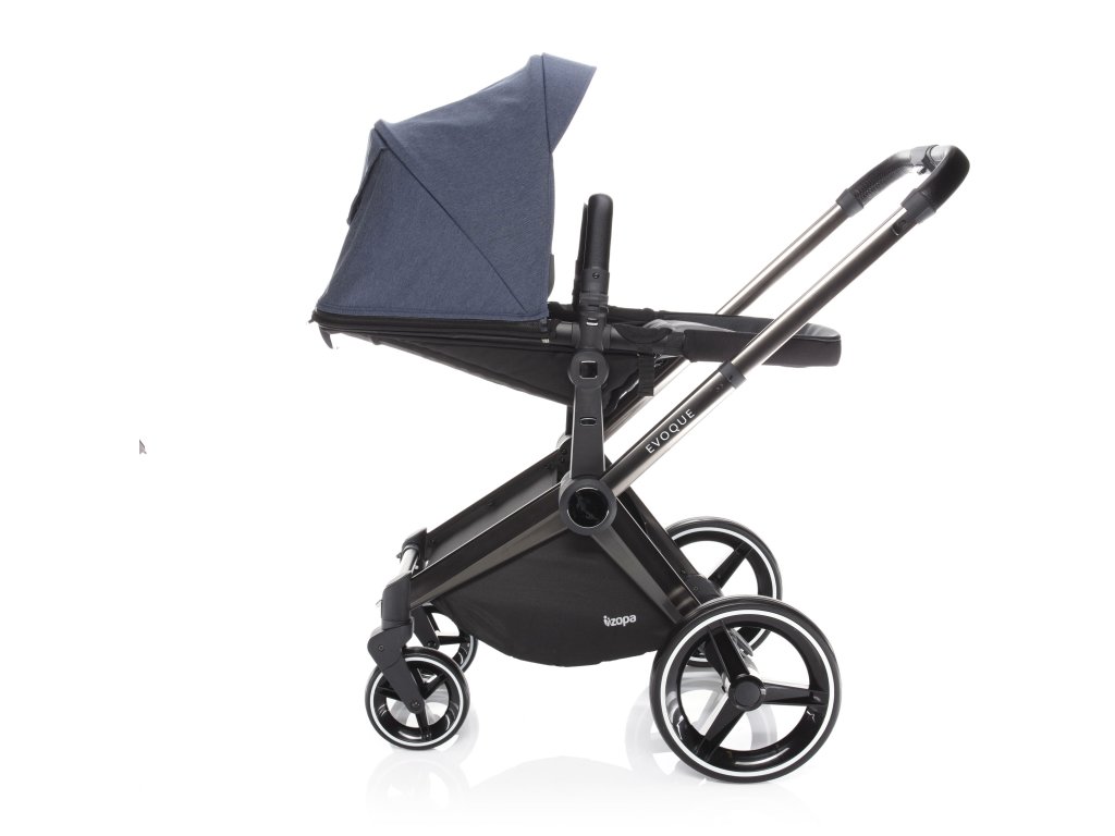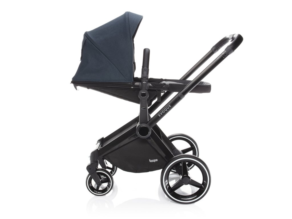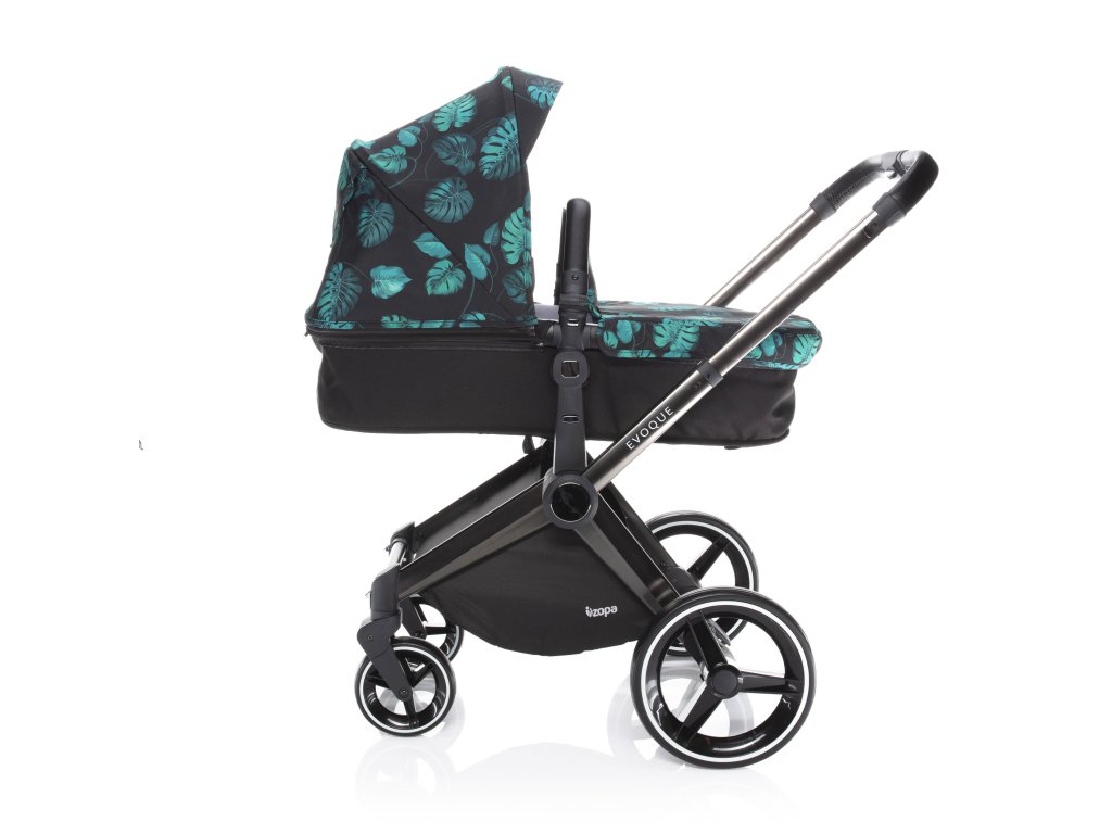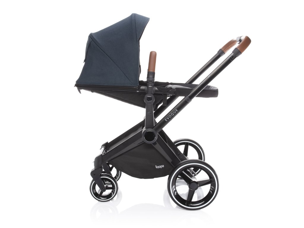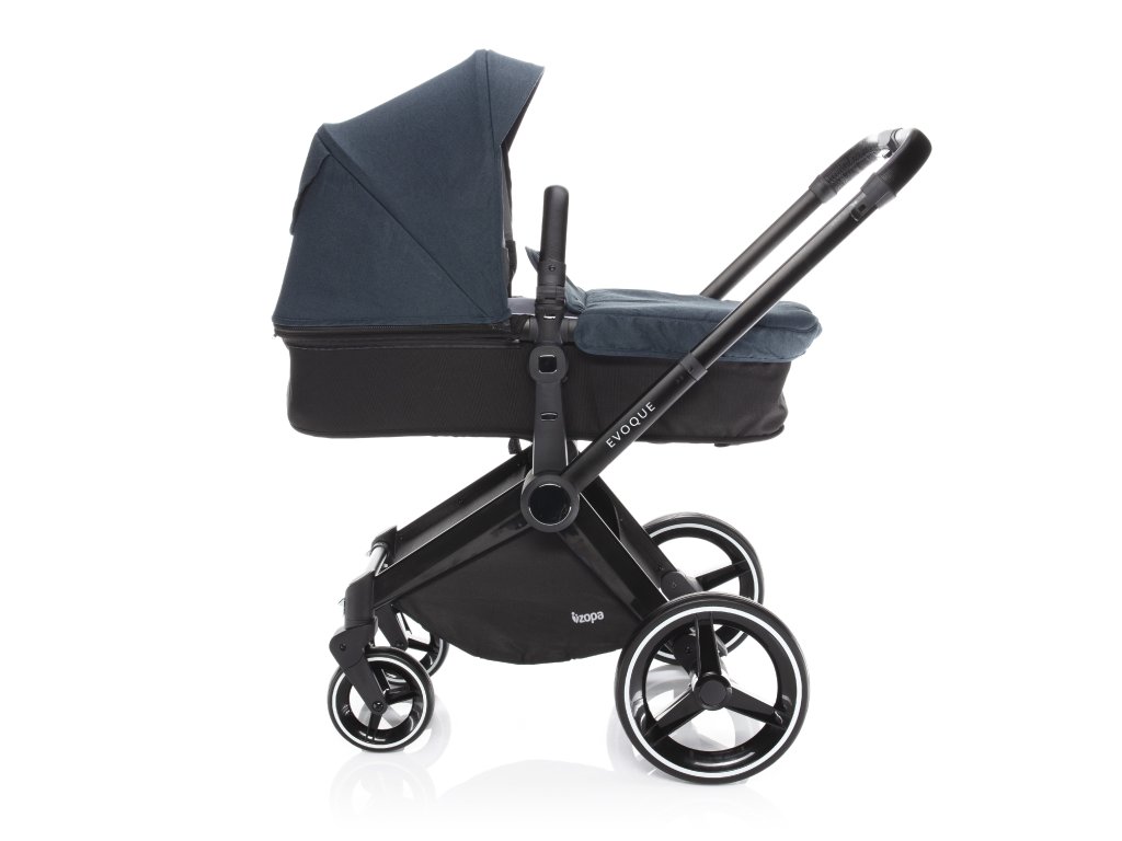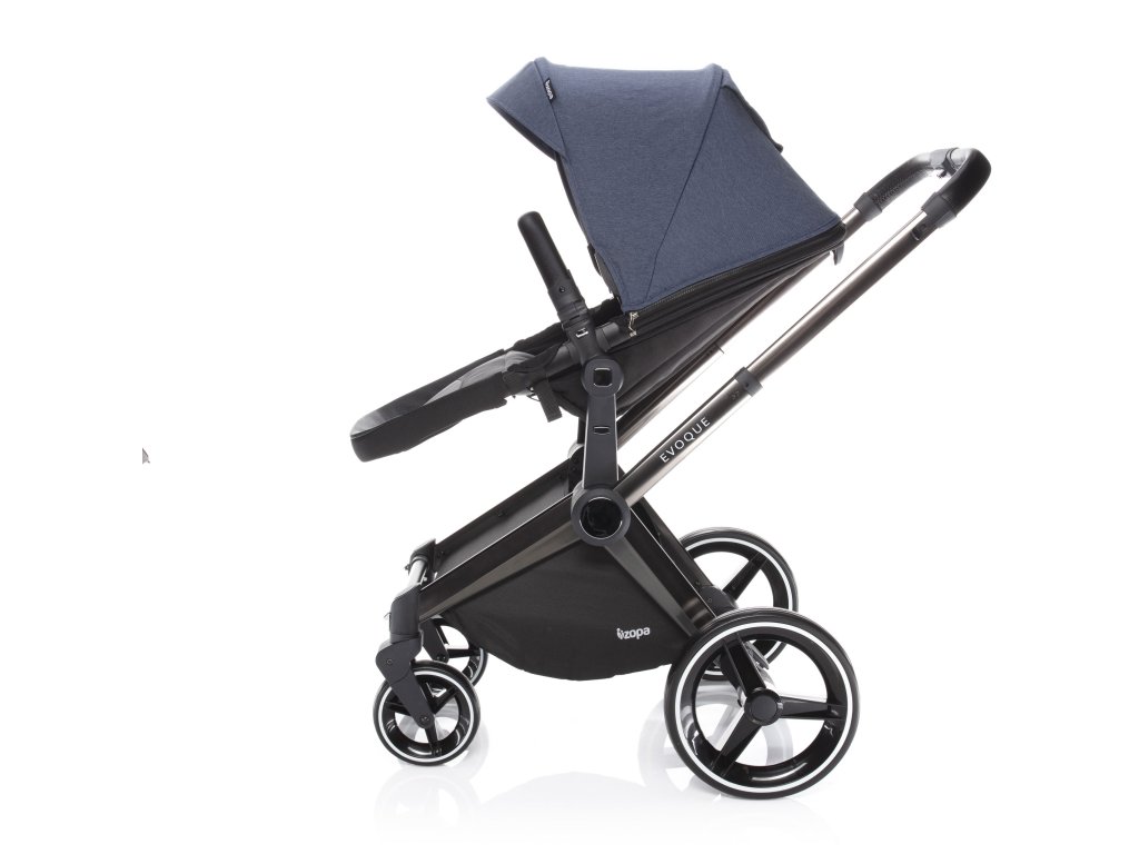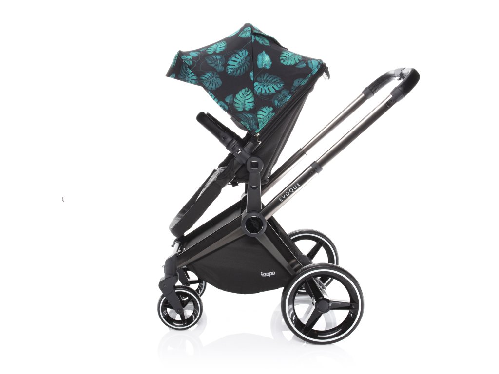Kočárek Zopa Evoque je designový ale zároveň praktický kočárek pro děti od narození do 15 kilogramů. Jedná se o dvojkombinaci, kdy se z rámu prostorné, hluboké korby vytvoří sportovní sezení. Sportovní sedačka je polohovatelná a lze umísti po i proti směru jízdy. Dítě chrání pětibodový bezpečnostní pás.