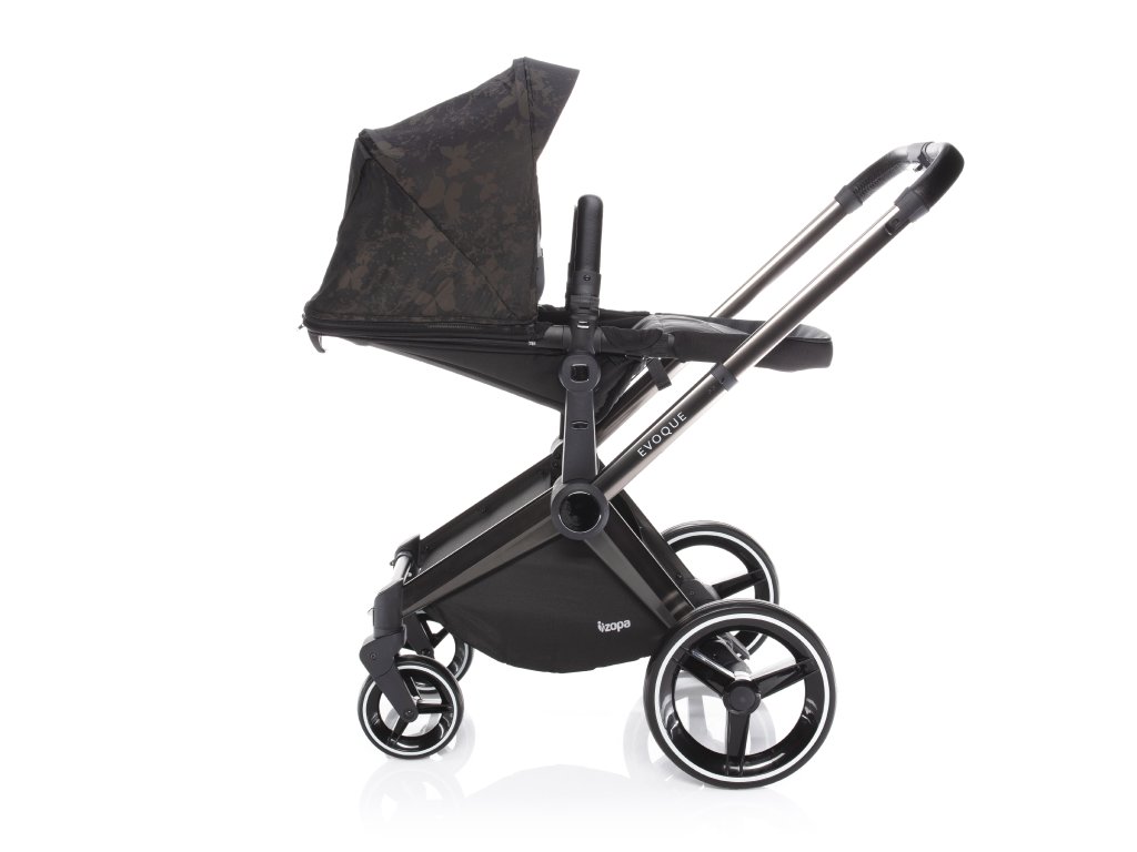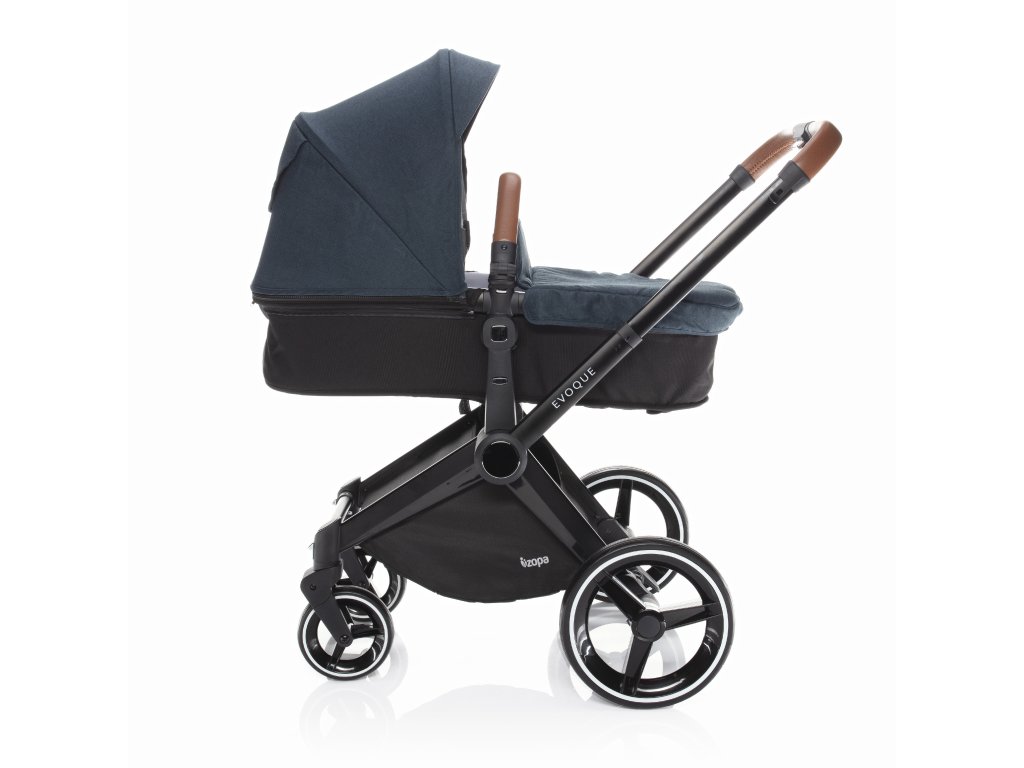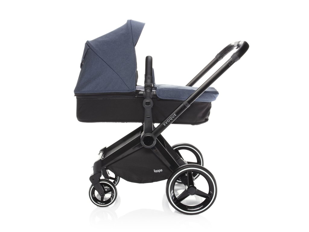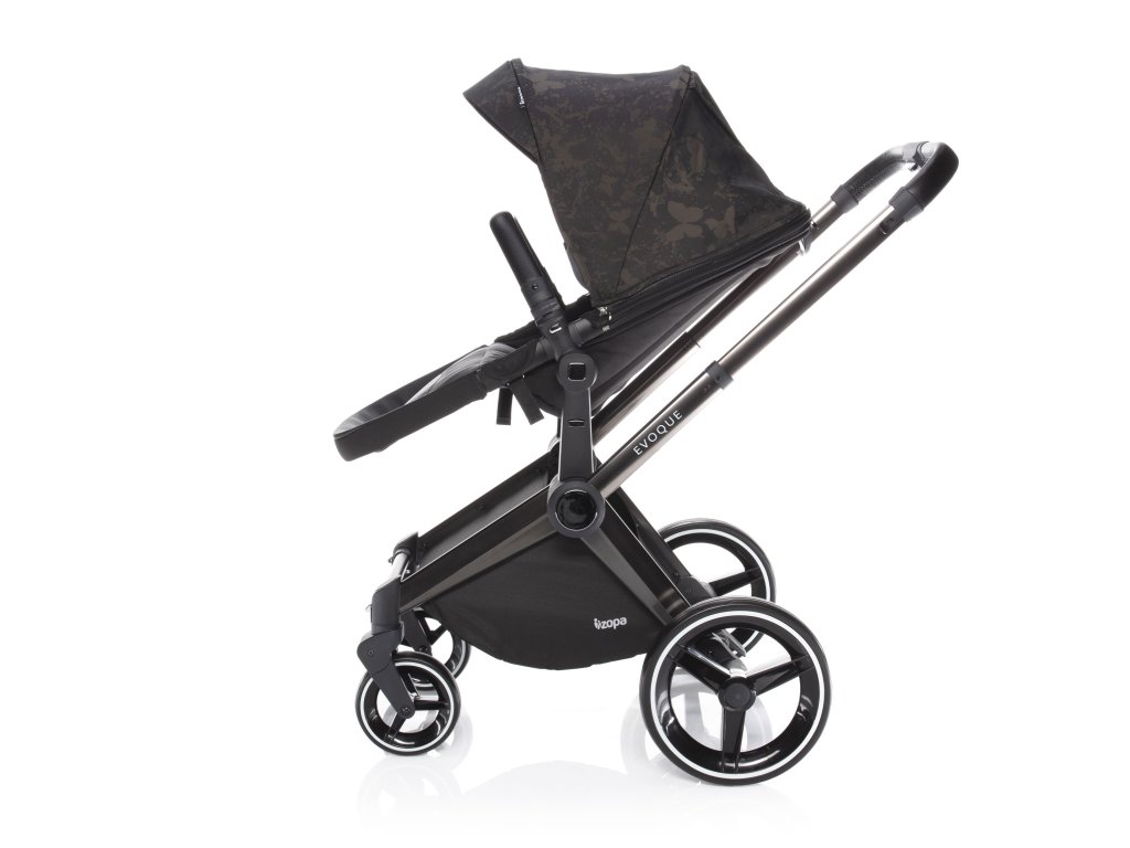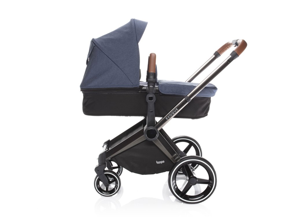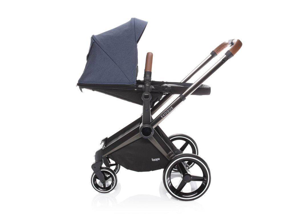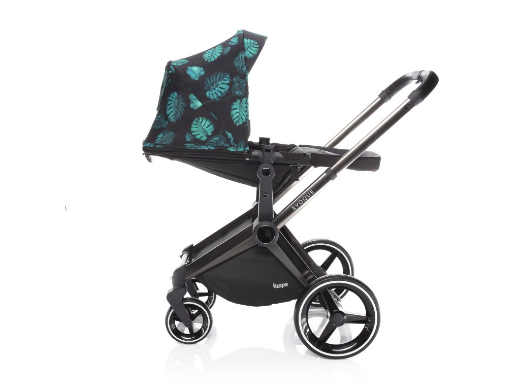 Kočárek Zopa Evoque je designový ale zároveň praktický kočárek pro děti od narození do 15 kilogramů. Jedná se o dvojkombinaci, kdy se z rámu prostorné, hluboké korby vytvoří sportovní sezení. Sportovní sedačka je polohovatelná a lze umísti po i proti směru jízdy. Dítě chrání pětibodový bezpečnostní pás.