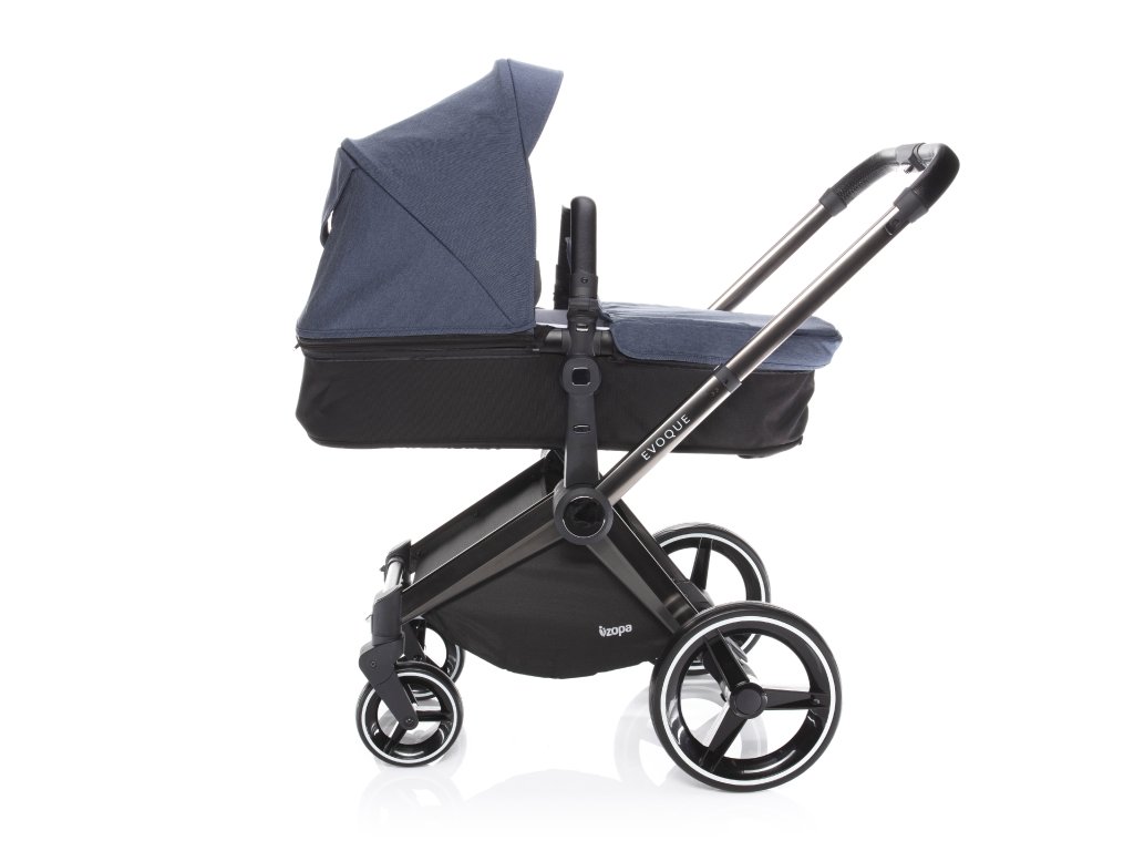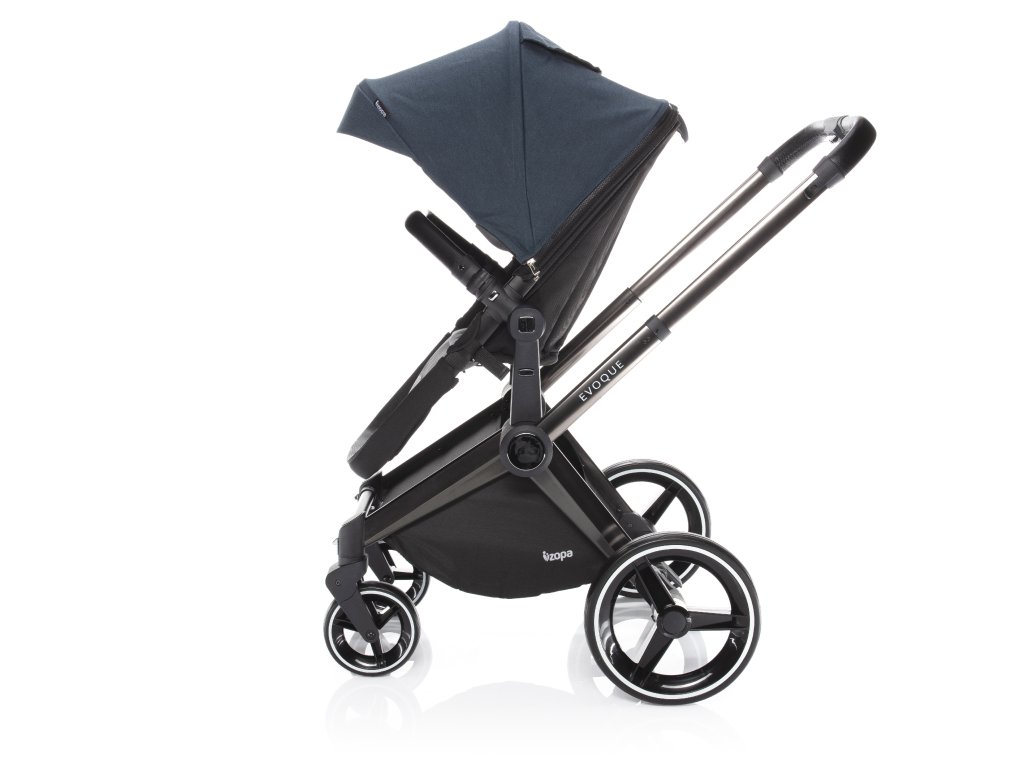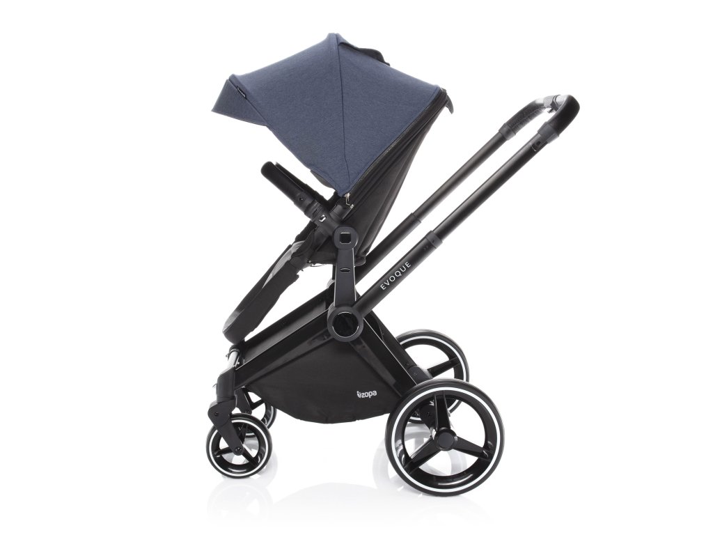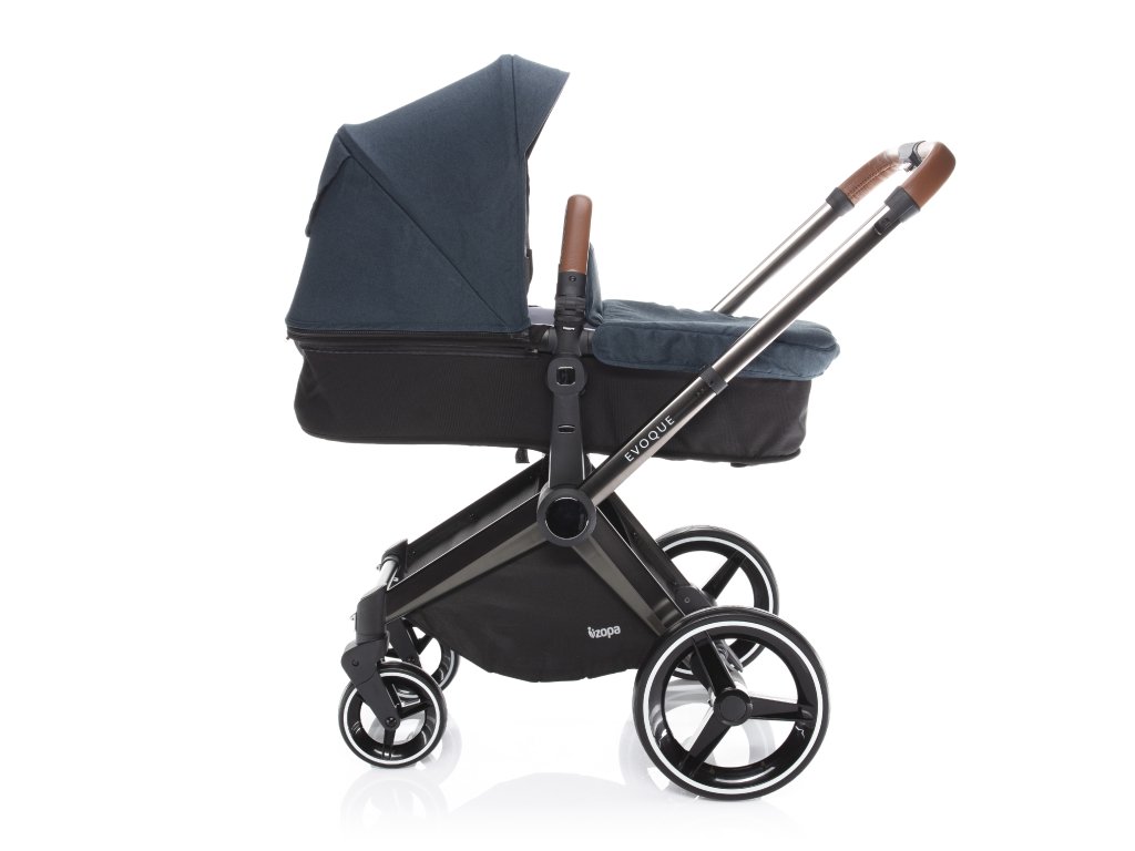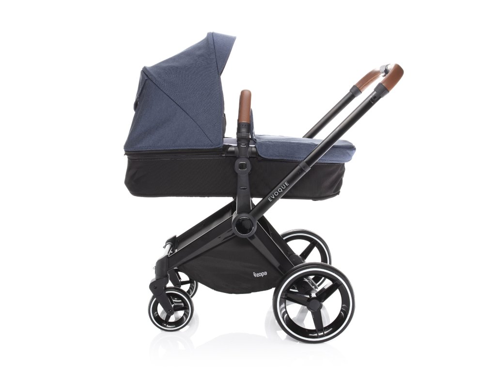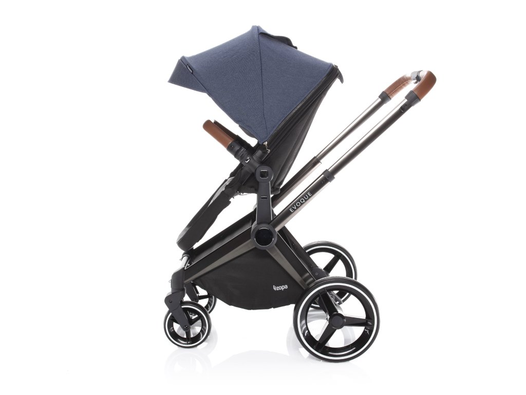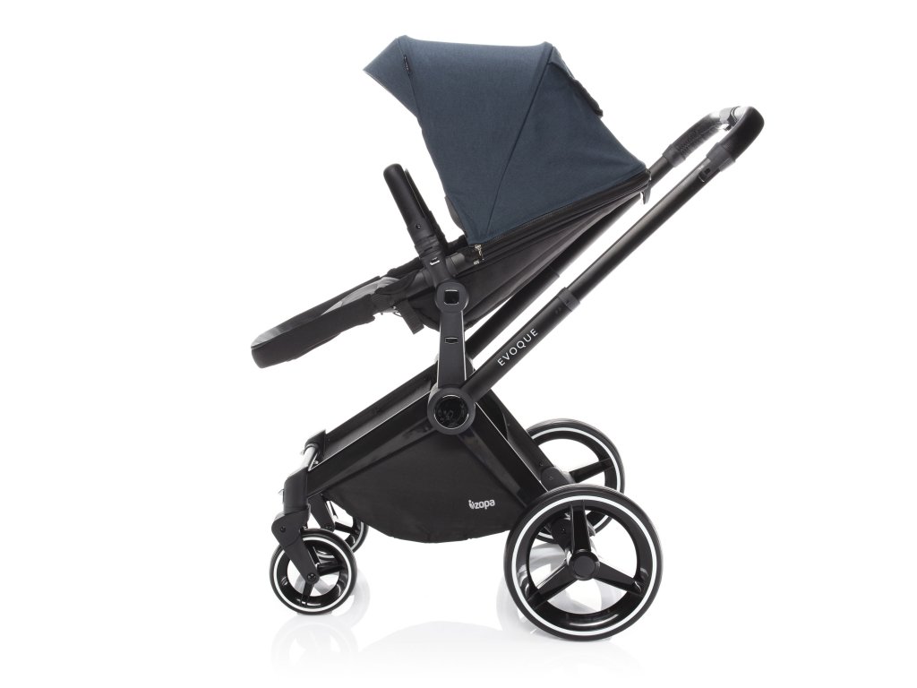 Kočárek Zopa Evoque je designový ale zároveň praktický kočárek pro děti od narození do 15 kilogramů. Jedná se o dvojkombinaci, kdy se z rámu prostorné, hluboké korby vytvoří sportovní sezení. Sportovní sedačka je polohovatelná a lze umísti po i proti směru jízdy. Dítě chrání pětibodový bezpečnostní pás.