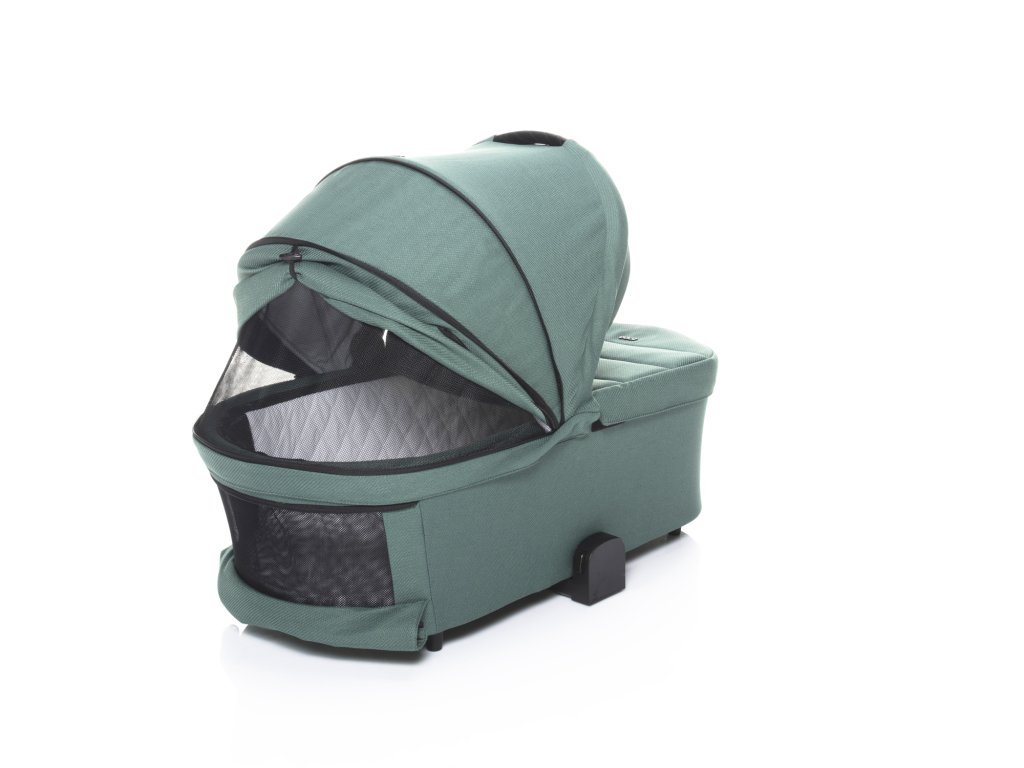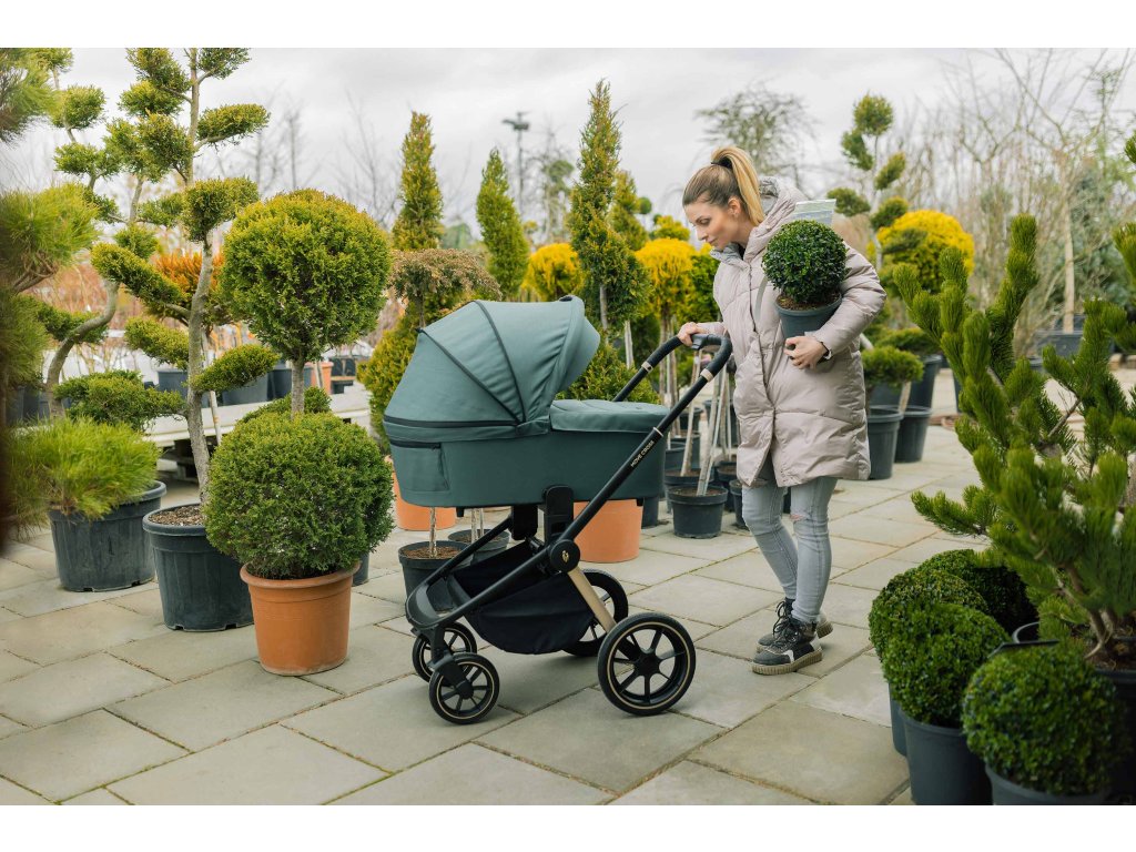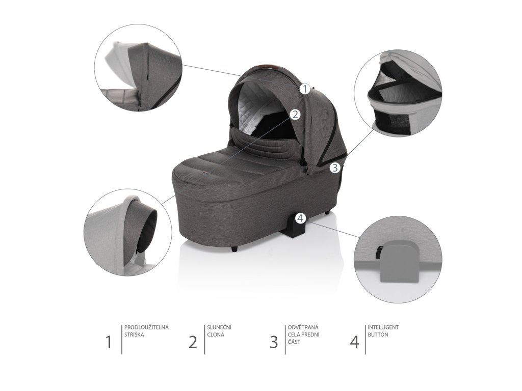 Korba Move XL je extra dlouhá, pohodlně do ní vejdou i větší miminka se zimním fusakem. Díky větracímu okénku na přední straně korby a odvětrané stříšce uvidí z polohy na bříšku malí objevitelé celý svět.