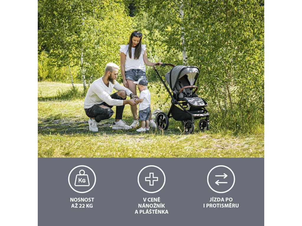 Prodloužitelná stříška spolu s nánožníkem ochrání miminko před chladem i ostrými slunečními paprsky.