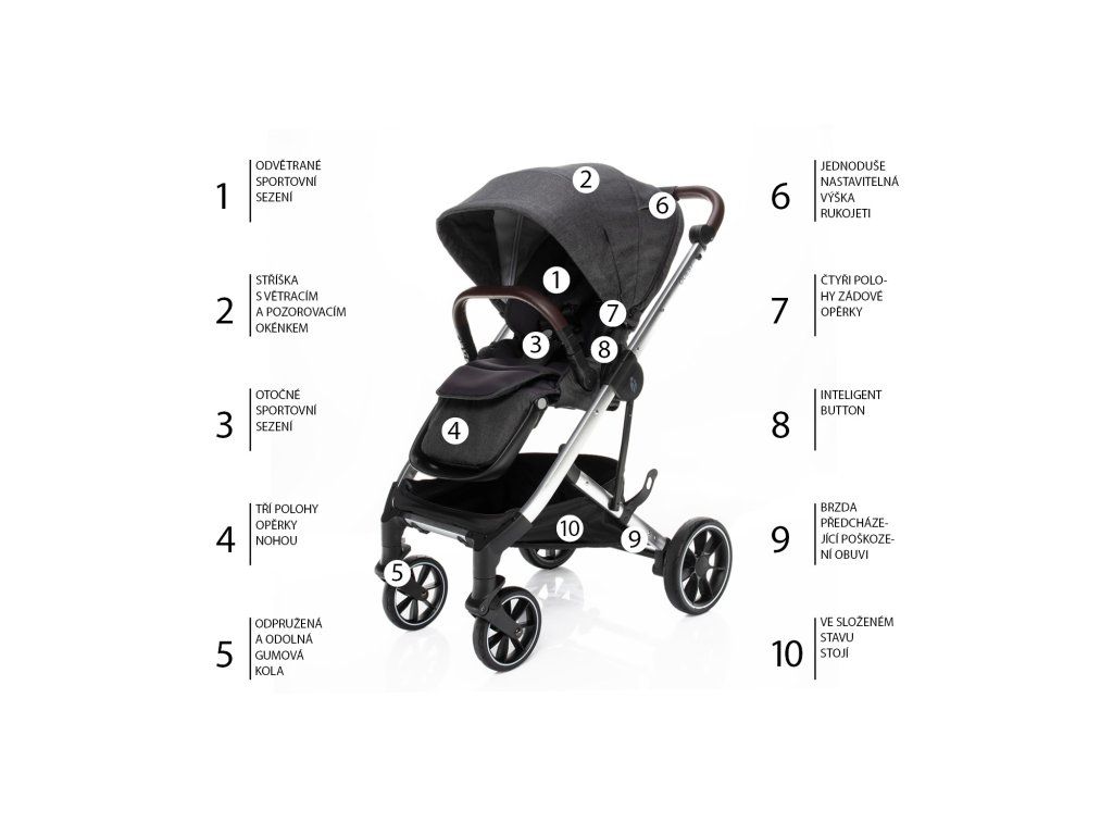 Součástí setu je podvozek se sportovním sezením, hluboká korba, adaptéry, autosedačka a isofixová báze na autosedačku.