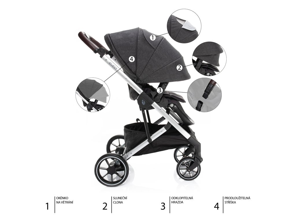Korba kočárku Quest je prostorná a měkce polstrovaná. Hlavovou opěrku lze nastavit do 4 pozic, což předchází refluxu miminek. Až se dítě převalí na bříško a bude chtít objevovat okolí, potěší ho, že celou přední část korby tvoří větrací okénko, ze kterého uvidí ven. Větrání se dá snadno uzavřít.