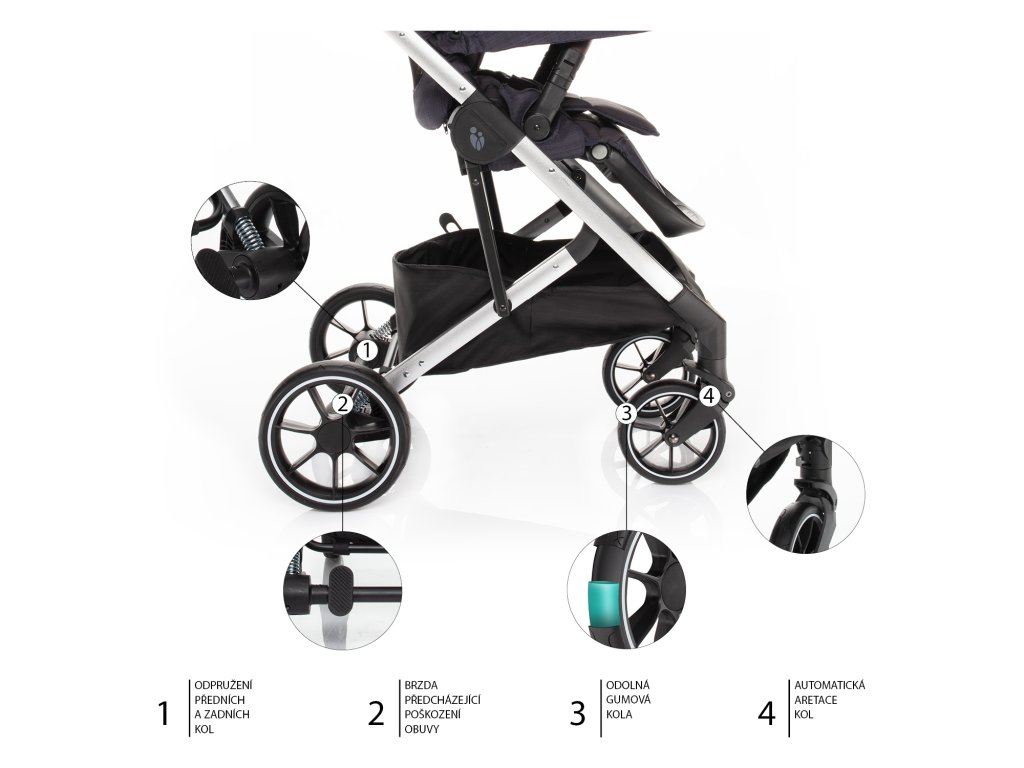 Kočárek Quest se pyšní velkými koly odolnými proti defektu. Všechna 4 jsou odpružená. Brzda se sešlapává shora, neničíte si tak obuv.