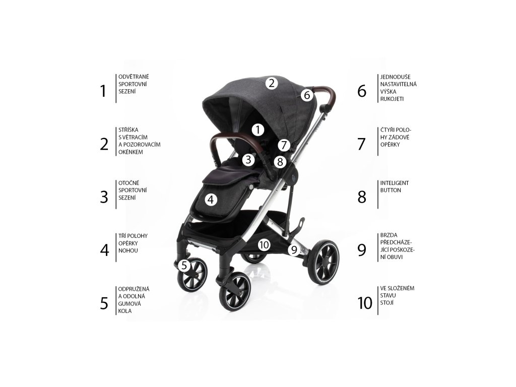 Ve složeném stavu kočárek sám stojí a snadno se přenáší díky madlu a pojistce proti rozložení. Novinkou je systém pojistek Intelligent buttons pro hladkou manipulaci a snadnější sundání sportovního sezení a korby z podvozku.