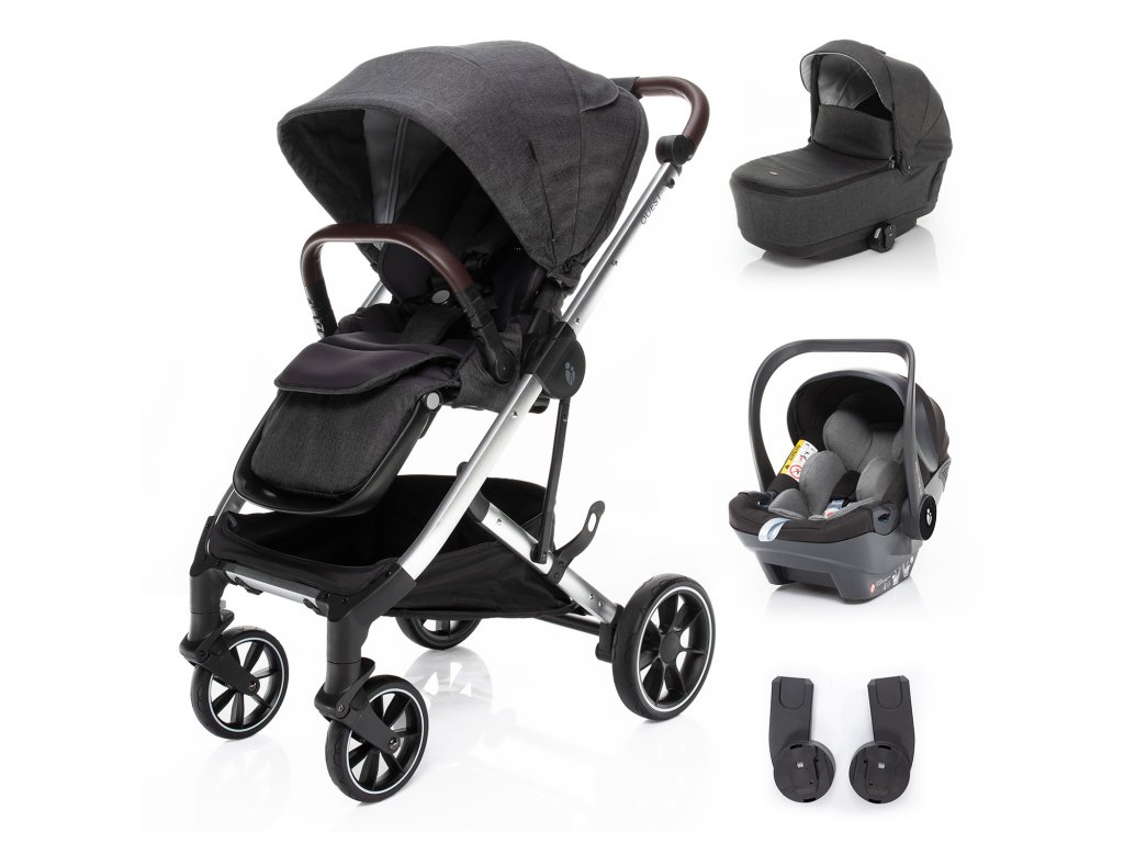 Součástí setu je podvozek se sportovním sezením, hluboká korba, adaptéry, autosedačka a isofixová báze na autosedačku.