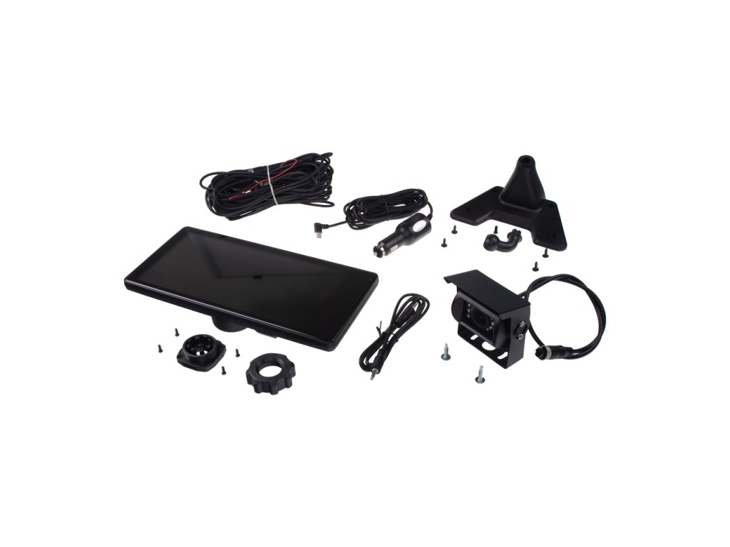 Obsah balení: Monitor, držák pro pevnou montáž + oboustranná páska, napájecí kabel s CL pro připojení na palubní napětí , zadní 4PIN kamera + 4PIN/2,5mm 15m propojovací kabel.