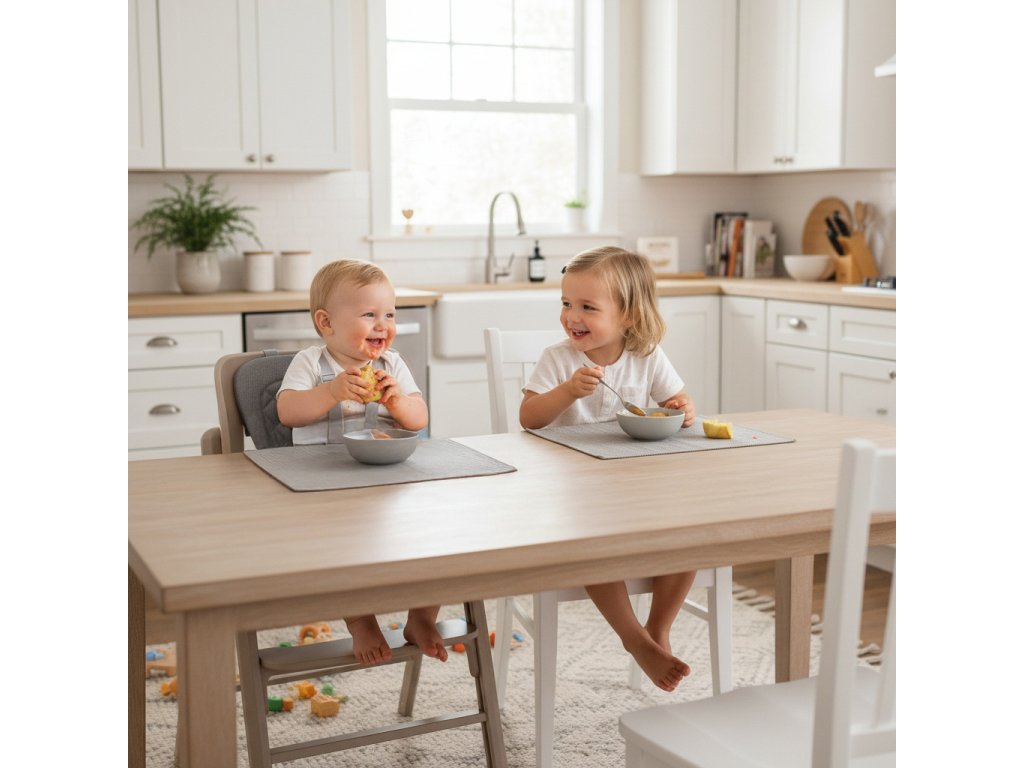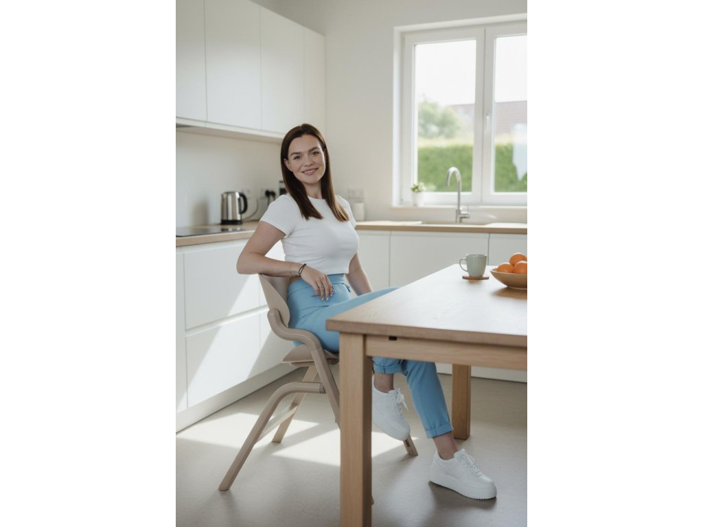 Jakmile dítě začne samostatně sedět, jednoduše odejmete novorozenecký set a získáte vysokou jídelní židličku s praktickým odnímatelným pultíkem. Sedák i opěrku nohou lze výškově nastavit tak, aby se přizpůsobily každé fázi růstu.