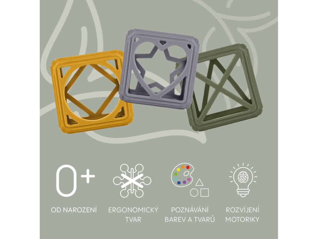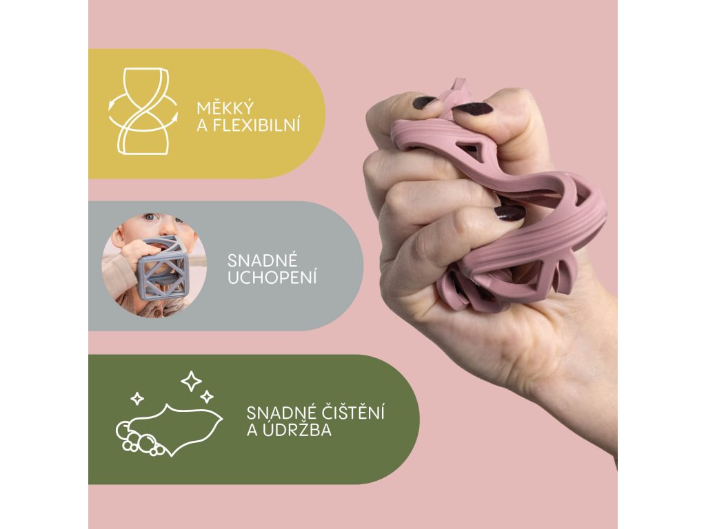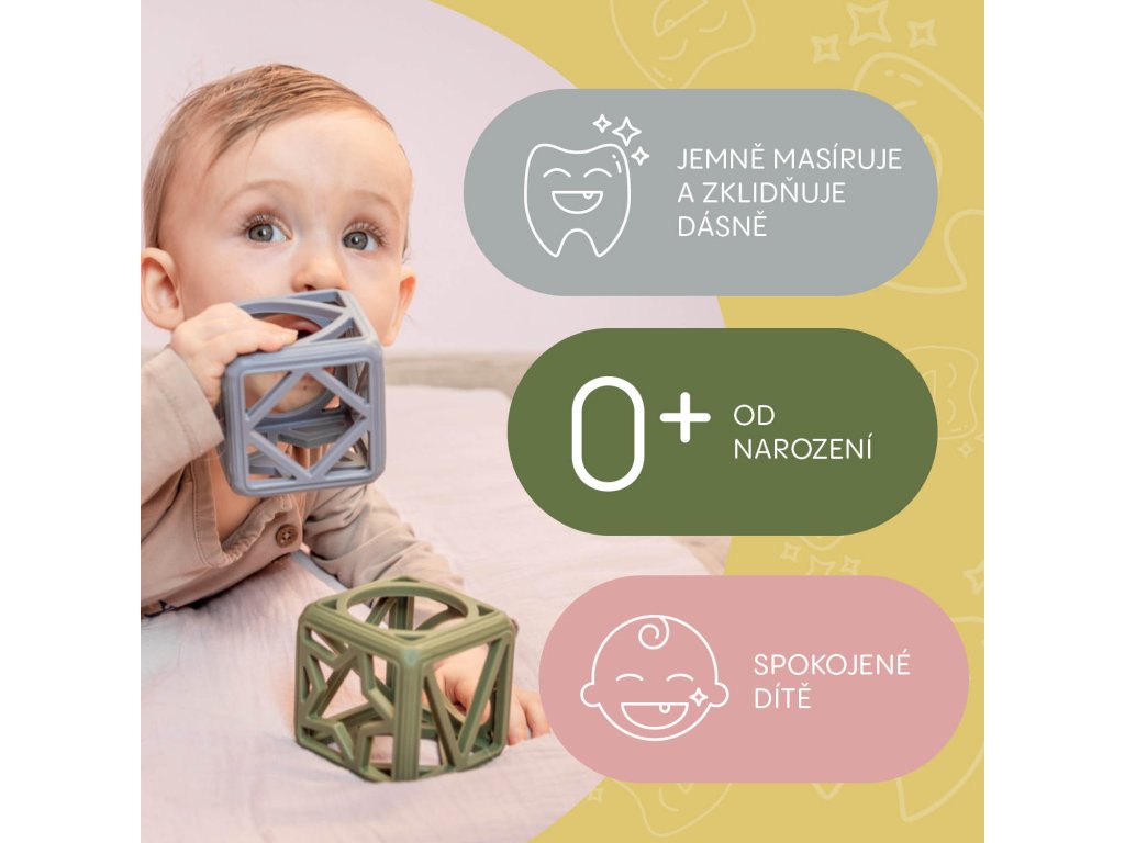 Pomozte svému miminku překonat náročné období prořezávání zoubků se silikonovým kousátkem Square. Jeho jedinečný geometrický tvar skvěle padne do malých ručiček a nabízí účinnou masáž dásní, která zmírňuje nepříjemné pocity při prořezávání zoubků.