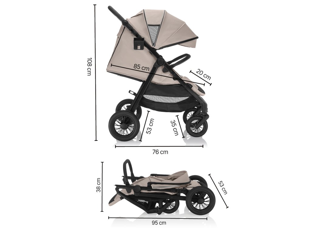 • Rozměry rozloženého kočárku: 108 × 76 × 85 cm