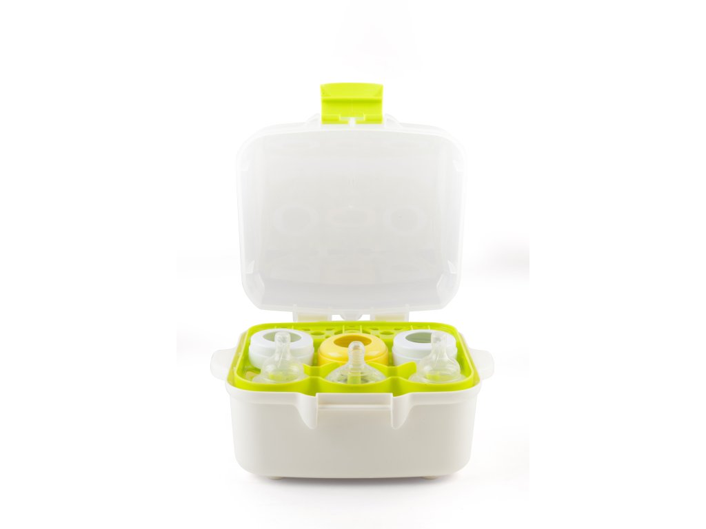 Čtvercový sterilizátor pojme 3 kojenecké lahve včetně příslušenství, široké kojenecké lahve 330 ml 2 ks