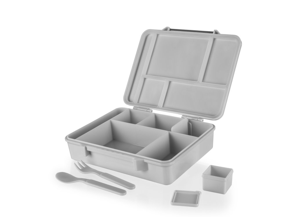 Díky několika prostorným přihrádkám různých velikostí (500 ml, 330 ml, 220 ml, 150 ml a 130 ml) můžete připravit pestrý a vyvážený oběd s sebou. Malá nádobka na omáčku a integrovaná vidlička se lžičkou jsou samozřejmostí.