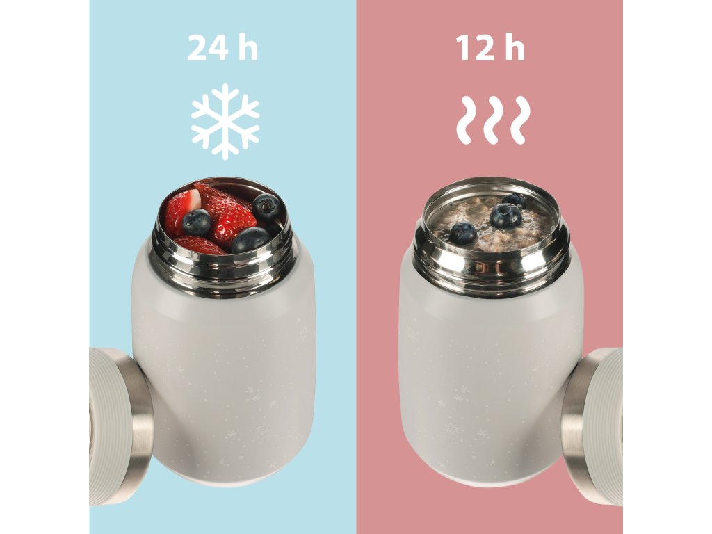 Kvalitní termoska na jídlo a příkrmy o objemu 500 ml uchovává horké jídlo až 12 hodin, studené až po dobu 24 hodin. Je vyrobena z kvalitní nerezové oceli, která je odolná vůči korozi. Těsné víčko zajišťuje, že termoska neprotéká. Díky vakuové izolaci se termoska při naplnění horkým obsahem nezahřívá z venku.