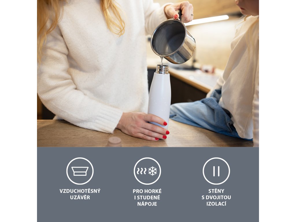 Používáním termosek na tekutiny pomáháte redukovat spotřebu plastů. Termosku myjte v ruce, není vhodná do myčky nádobí.