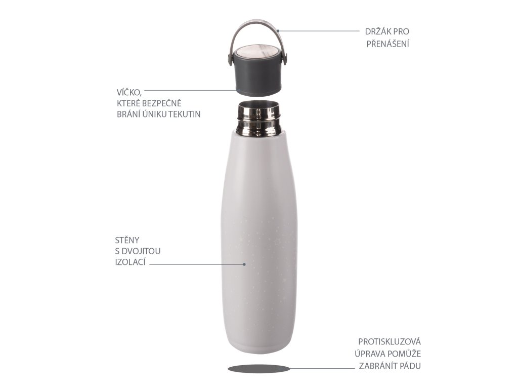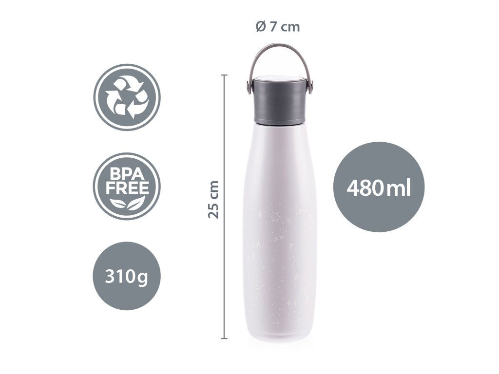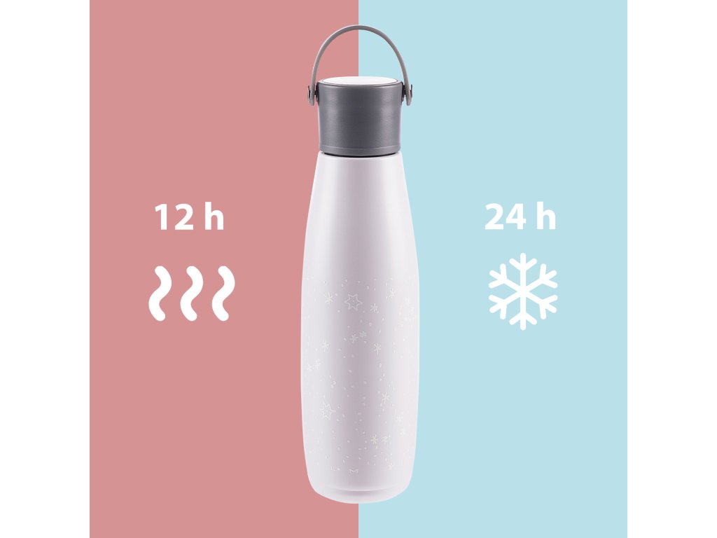 Kvalitní termoska na tekutiny o objemu 480 ml uchovává horké nápoje až 12 hodin, studené až po dobu 24 hodin. Je vyrobena z kvalitní nerezové oceli, která je odolná vůči korozi. Těsné víčko zajišťuje, že termoska neprotéká. Díky vakuové izolaci se termoska při naplnění horkou tekutinou nezahřívá z venku. K pohodlnému uchopení je termoska vybavená držákem.