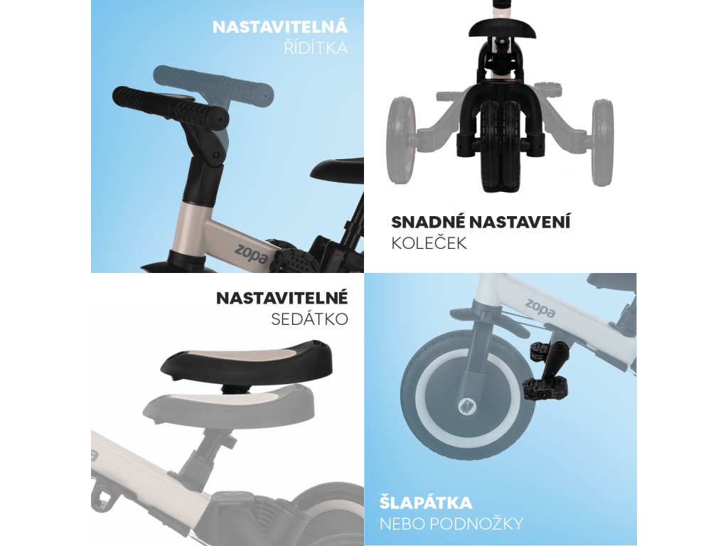 Tříkolka Zopa Razor Pro 6v1 – rostoucí tříkolka s vodící tyčí. Hledáte tříkolku, která se dokonale přizpůsobí vývoji vašeho dítěte? Zopa Razor Pro 6v1 je promyšlená a stylová dětská tříkolka, která poroste spolu s vaším malým jezdcem – od prvních krůčků až po samostatnou jízdu na kole. Kombinuje ...