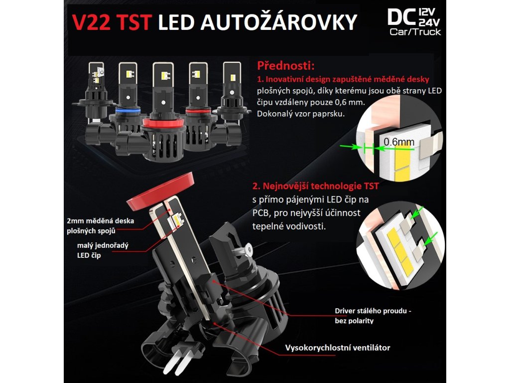 LED žárovky V22 také využívají menší čipy CSP-5540 a zapuštěnou desku plošných spojů. Mezi oběma stranami čipů je vzdálenost pouze 0,6 mm, což umožňuje jasný a zřetelný obrazec paprsku.