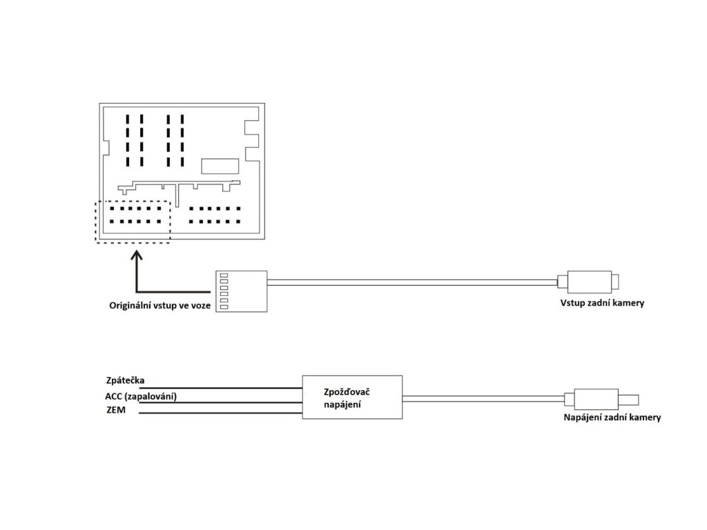 Součástí balení je filtr napájení pro odstranění rušení včetně prodlužovače napájení (zajistí, aby byla kamera napájena ještě 10s po vyřazení zpátečky).