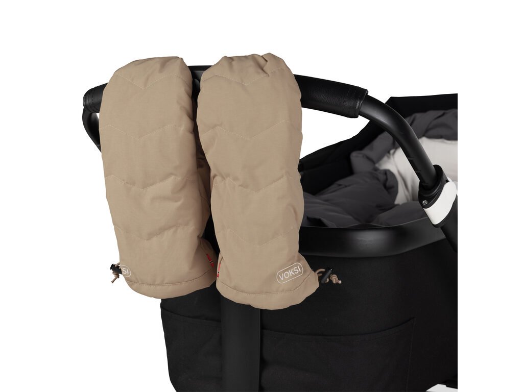 Rukavice jsou navržené tak, aby se vešly na všechny ruce i typy kočárků. Připevněte palčáky ke kočárku tak, že na špičce rukavice otevřete suchý zip a umístíte jej kolem rukojeti. Jednoduchou šňůrku na straně lze zatáhnout rukavice, aby obepnuly zápěstí a nedostala se do nich zima. Kombinujte a slaďte barvy rukavic s fusaky a dětskými botičkami Voksi.