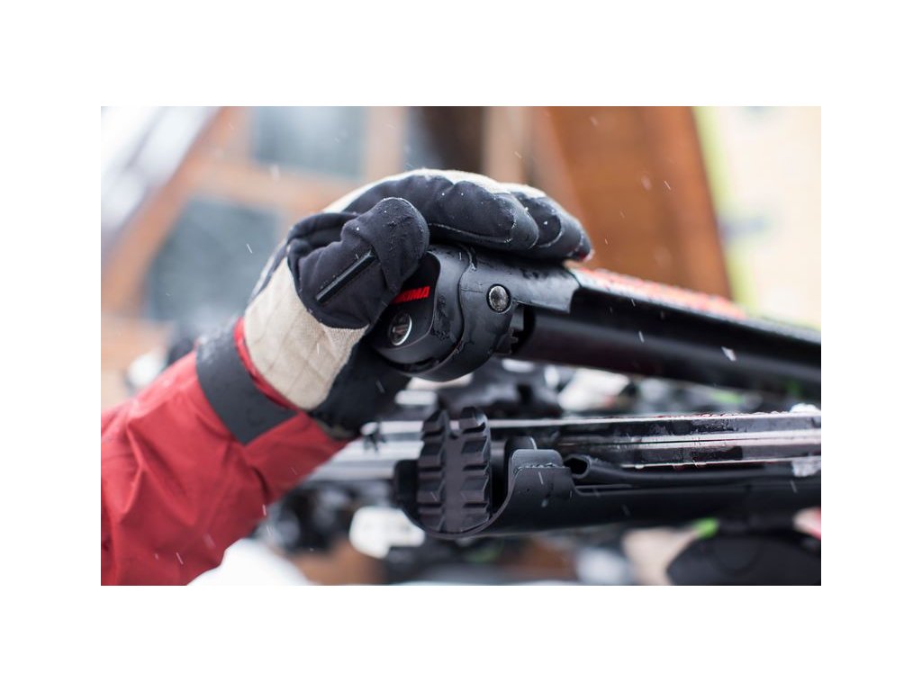 Manipulace s nosičem Yakima FatCat je velmi praktická, a nezapomíná se ani na bezpečnost. Samozřejmostí je zamykání nosiče, samotné otevírání zabezpečuje velké tlačítko, se kterým se velmi snadno manipuluje i v lyžařských rukavicích | |