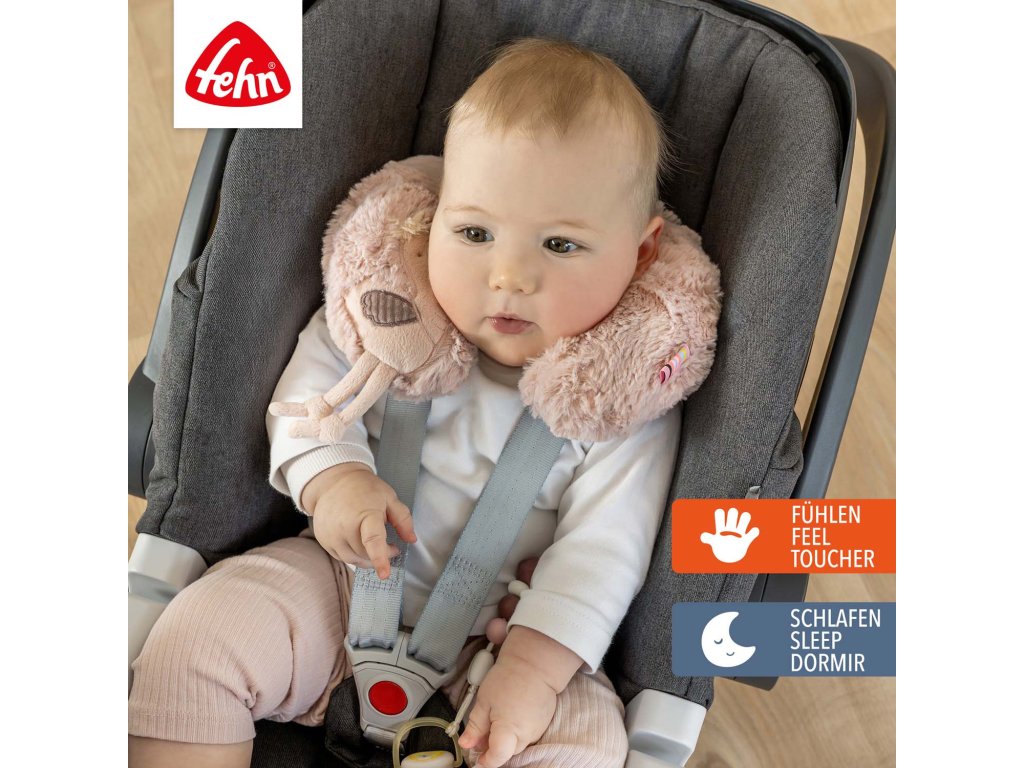 Pro klidný spánek na dlouhých i krátkých cestách autem: polštářek za krk Plameňák z kolekce Lazy, Crazy & Pink zajišťuje bezpečnou oporu hlavičky miminka. Podporuje a ulevuje krční páteři a ramenům. Ergonomický tvar se přizpůsobí krčním křivkám dítěte a polstrované boční části brání tomu, aby hlavička přepadávala dopředu. Miminko je v bezpečném a pohodlném prostředí – ať už v autě, v hluboké korbě nebo v kočárku. Hebký plameňák dělá společnost i během těch nejdelších cest a zabaví i to nejneklidnější děťátko.